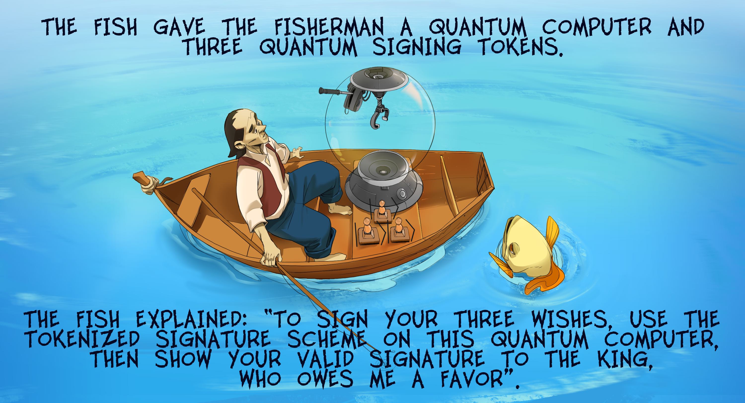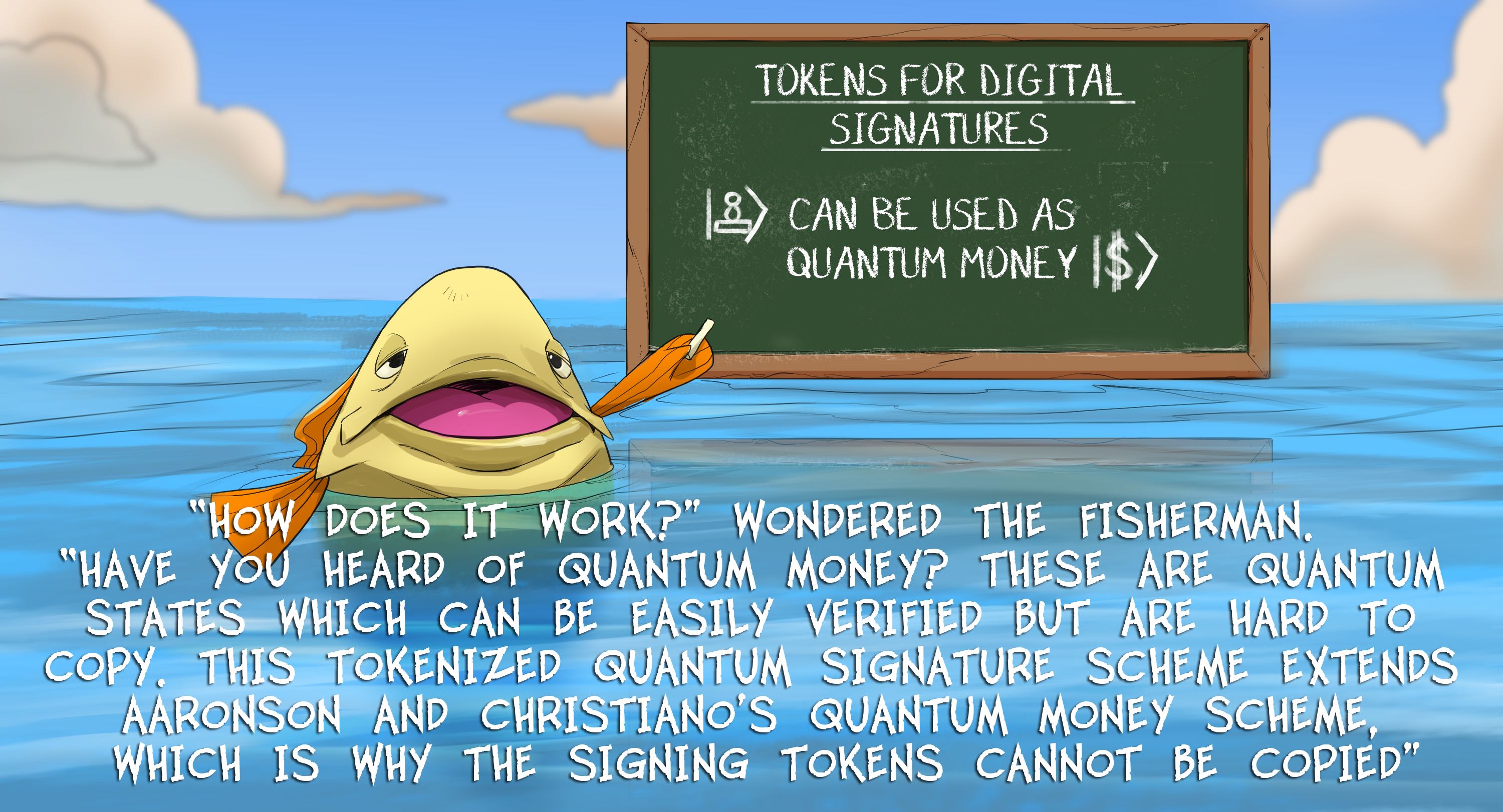 "How does it work?" wondered the fisherman. "Have you heard of quantum money? These are quantum states which can be easily verified but are hard to copy. This tokenized quantum signature scheme extends Aaronson and Christiano's quantum money scheme, which is why the signing tokens cannot be copied".