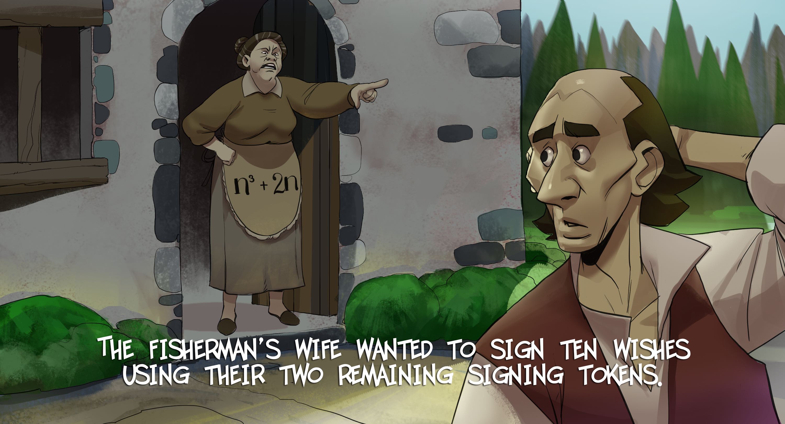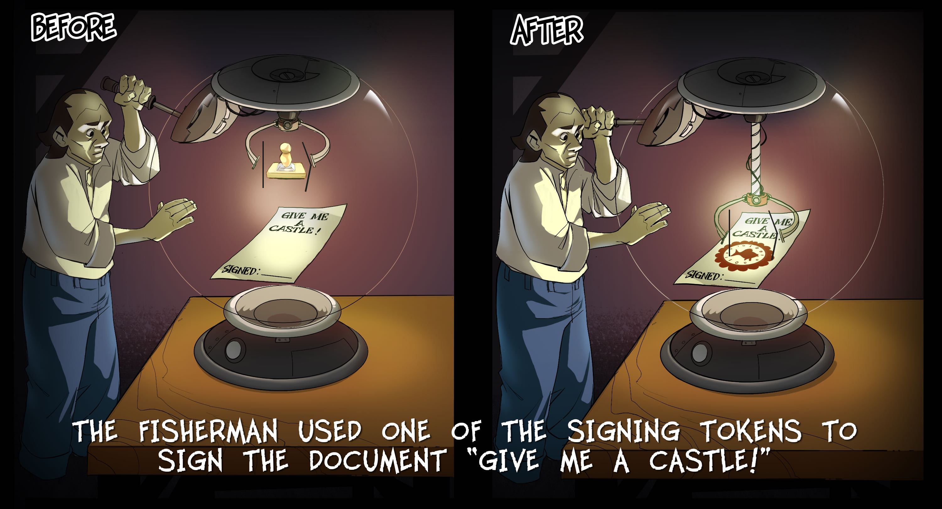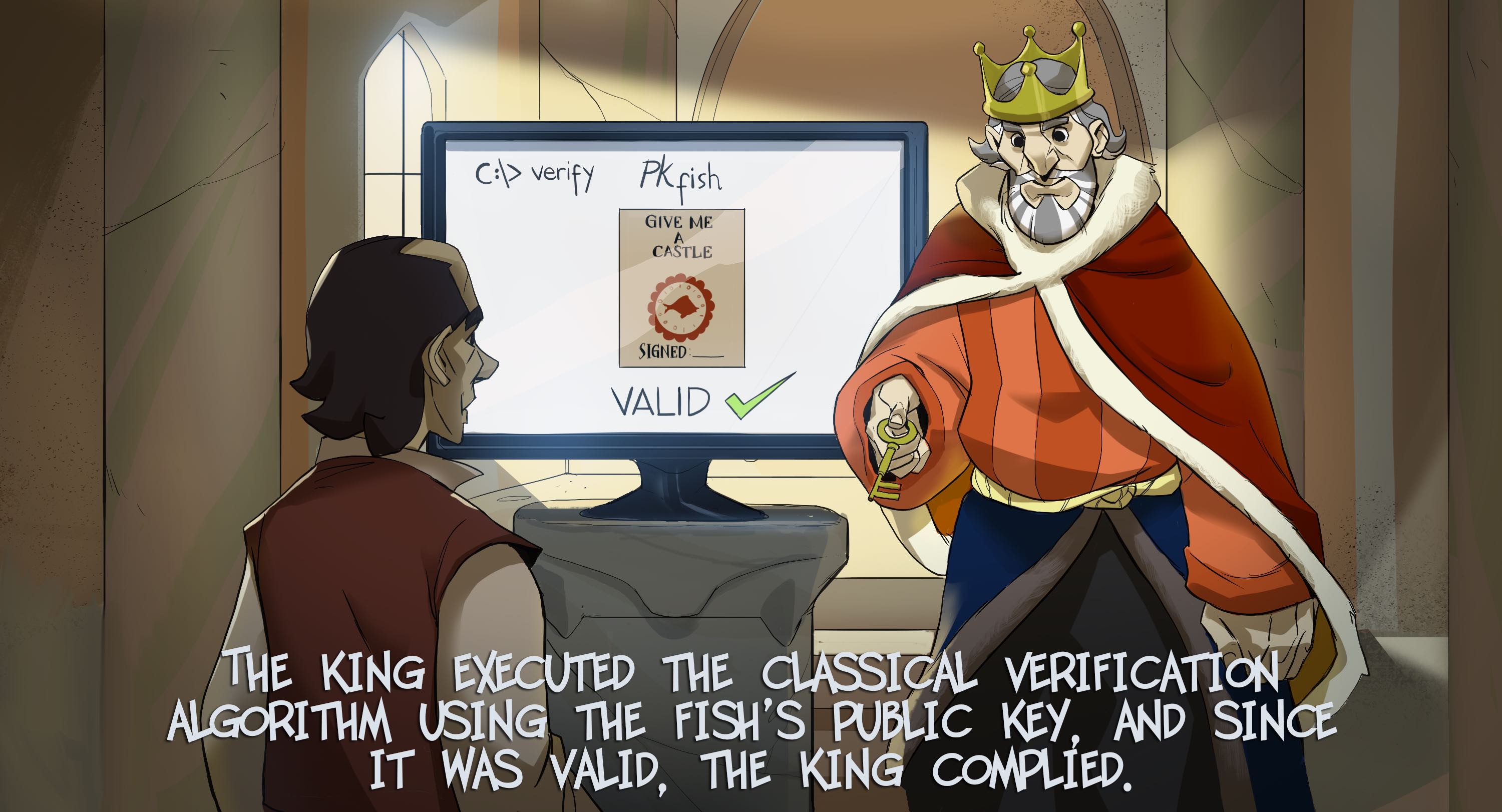 The fisherman used one of the signing tokens to sign the document "give me a castle!" and rushed to the palace. The king executed the classical verification algorithm using the fish's public key, and since it was valid, the king complied.