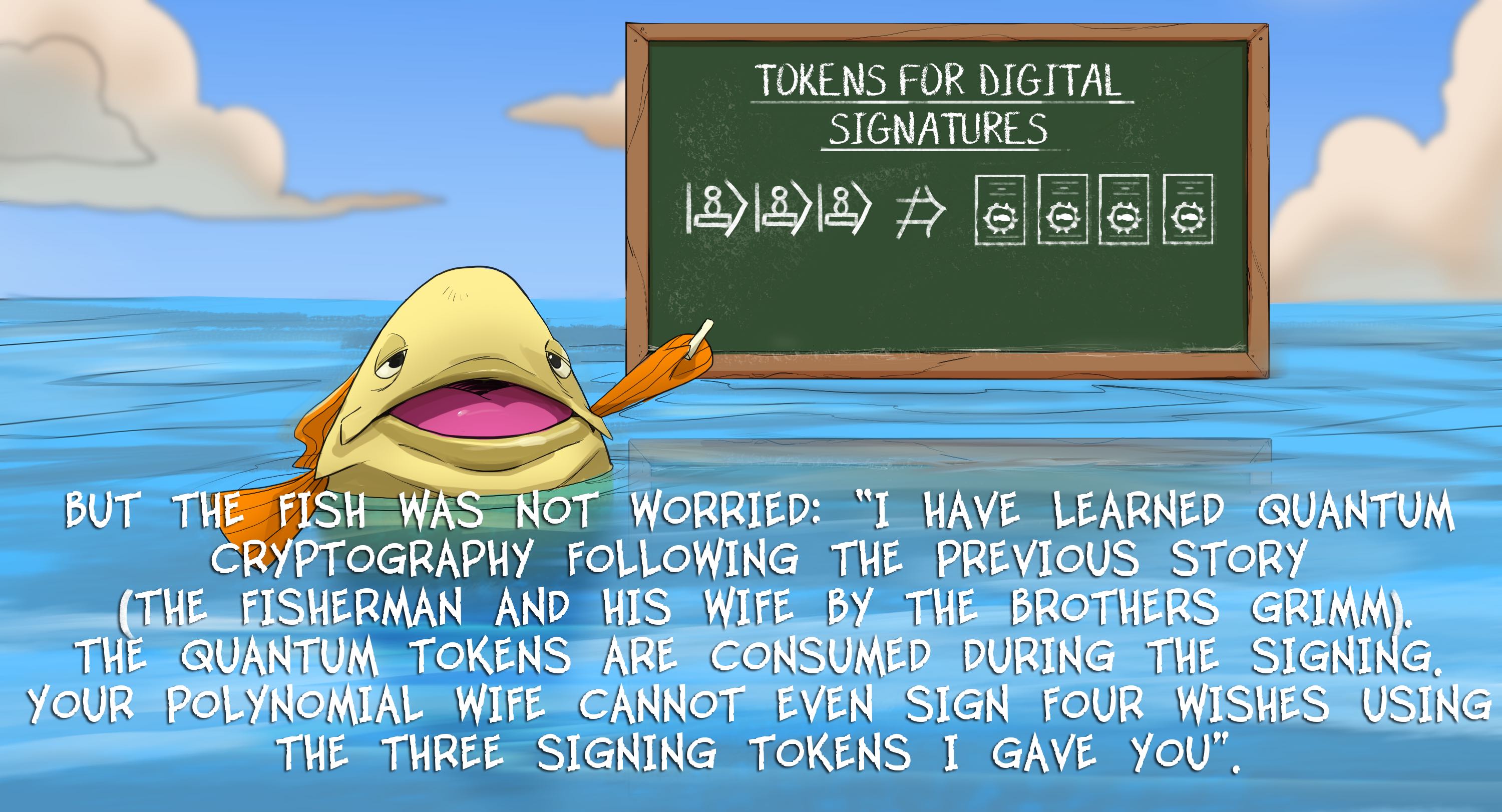 The fisherman's wife wanted to sign ten wishes using their two remaining signing tokens. The fisherman did not want to cheat, and secretly sailed to meet the fish. "Fish, my wife wants to sign ten more wishes". But the fish was not worried: "I have learned quantum cryptography following the previous story (The Fisherman and His Wife by the brothers Grimm). The quantum tokens are consumed during the signing. Your polynomial wife cannot even sign four wishes using the three signing tokens I gave you".