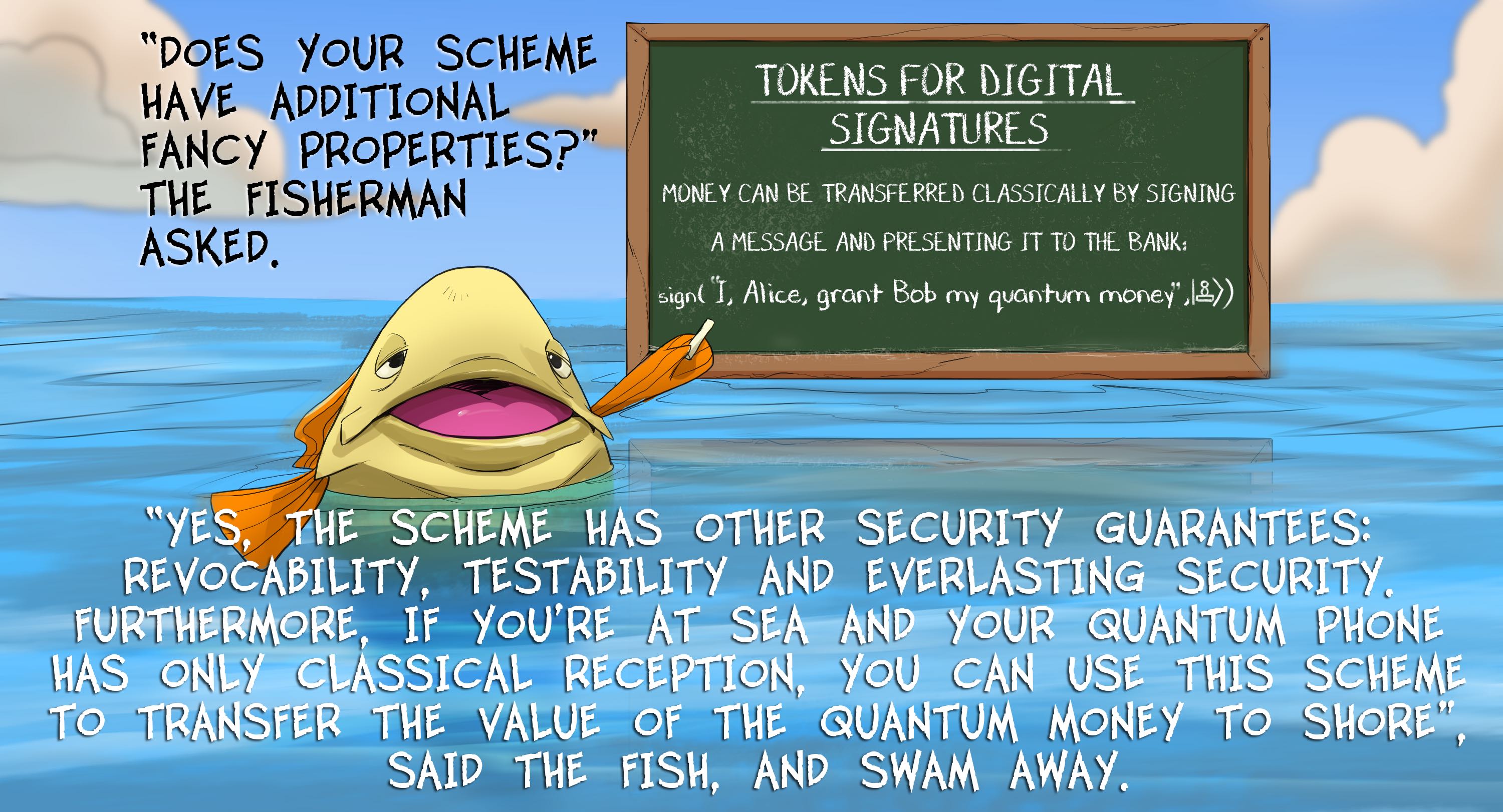 "Does your scheme have additional fancy properties?" the fisherman asked. "Yes, the scheme has other security guarantees: revocability, testability and everlasting security. Furthermore, if you're at sea and your quantum phone has only classical reception, you can use this scheme to transfer the value of the quantum money to shore", said the fish, and swam away.