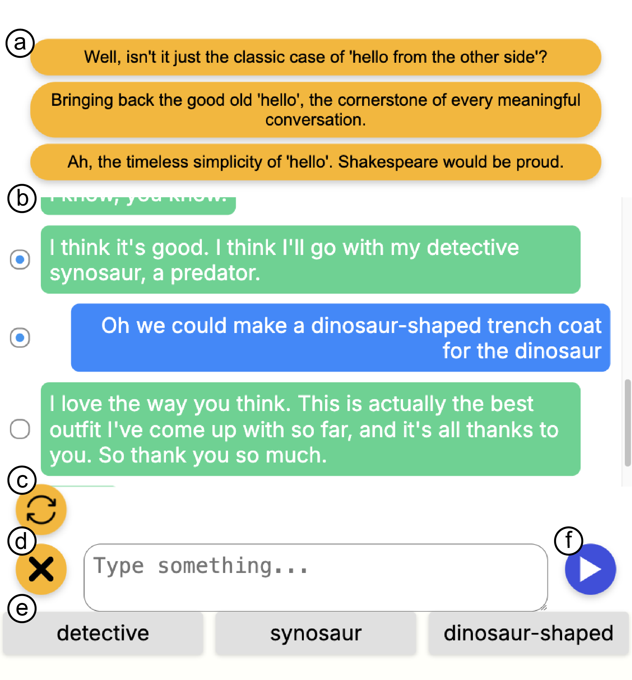 Recallability: Participants pointed out that one of the best features of all our interfaces was having access to the full transcript of the conversation in the Context Bubble Selection interface. The transcript not only allowed them to select the context bubbles for the AI to use but also as a source of material to think of jokes. Recalling P3 comments, being able to see the conversation while listening to their conversational partner helped her think of jokes and keep up with the conversation. Therefore, we recommend future designers to integrate a form of conversation visualization paired with an automatic speech recognition (ASR) toolkit. One way in which they could integrate such visualization could be following our example of the Context Bubble Selection interface.