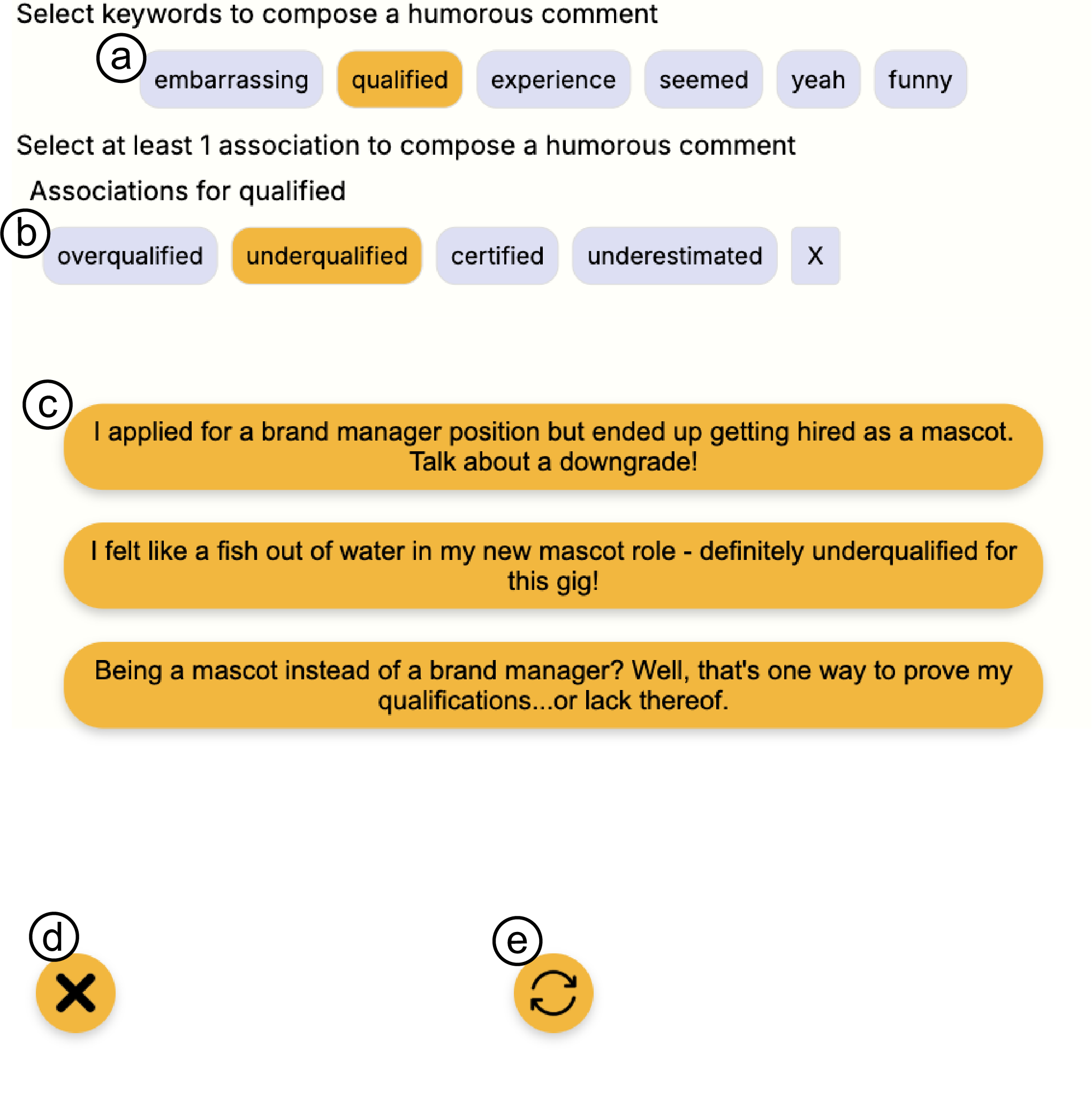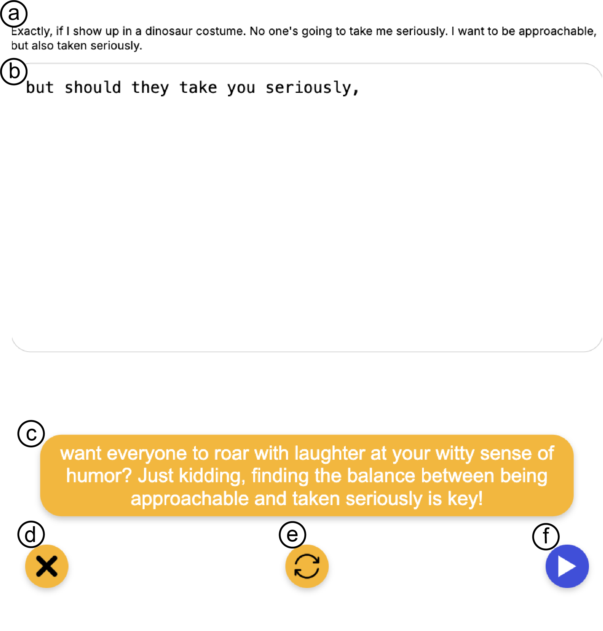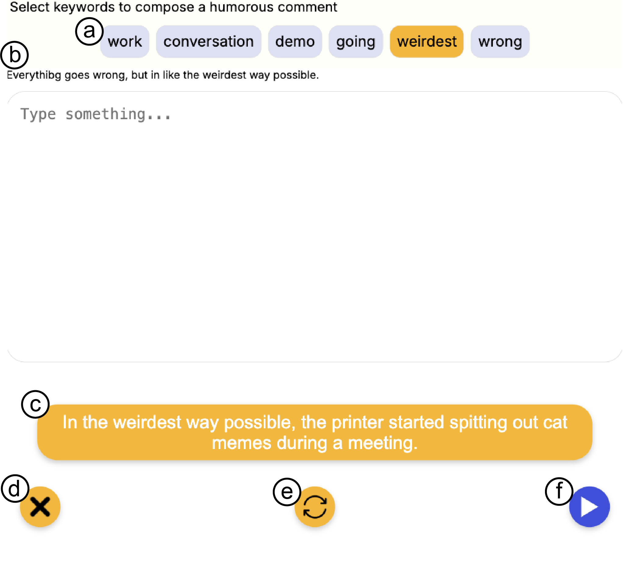 (a) We extended this base app with a “joke mode” which triggers the different forms of interfaces we explore in this section to support users in composing humorous comments. (b) Users can press the button to output their humorous comments through text-to-speech. (c) This example interface, later referred to as Keywords interface, displays keywords based on the ongoing conversation, which is captured and transcribed using automatic speech recognition (ASR). (d) Users either start typing their joke and/or select keywords to compose it. (e) The interface displays auto-completed suggestions for jokes and updates these as users provide more context. (f) If users dislike a suggestion, they can hit the refresh button to get a new one. Once the user is satisfied with a suggestion, they select it and copy it into the input field. From there, they can either play the text immediately or make further customizations.
