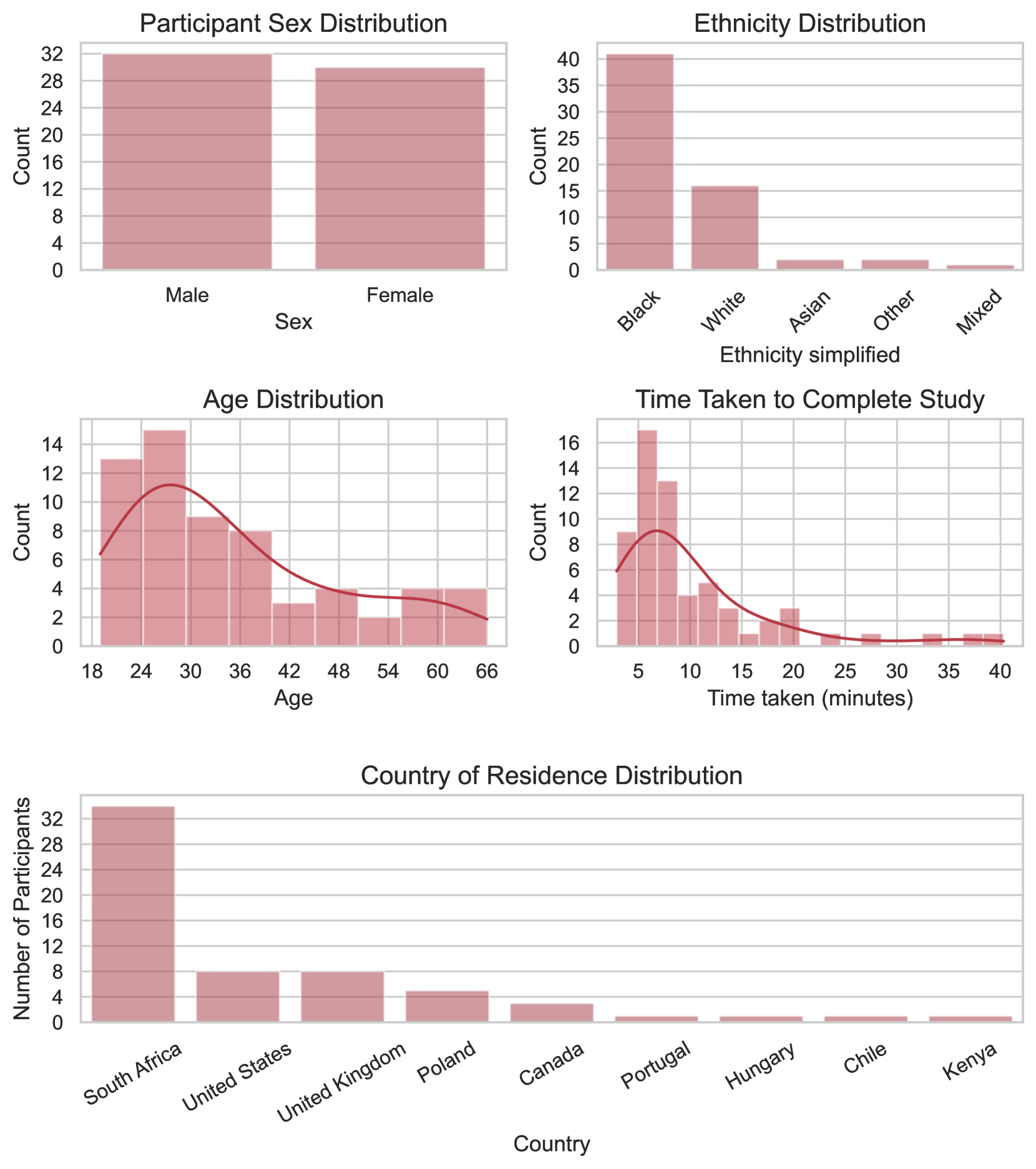 See Fig. 10 for the demographics of the 65 valid participants (those who passed all attention checks). Demographic data of some participants is missing and hence not plotted. All participants are paid an hourly rate of 12 USD regardless of their residence.