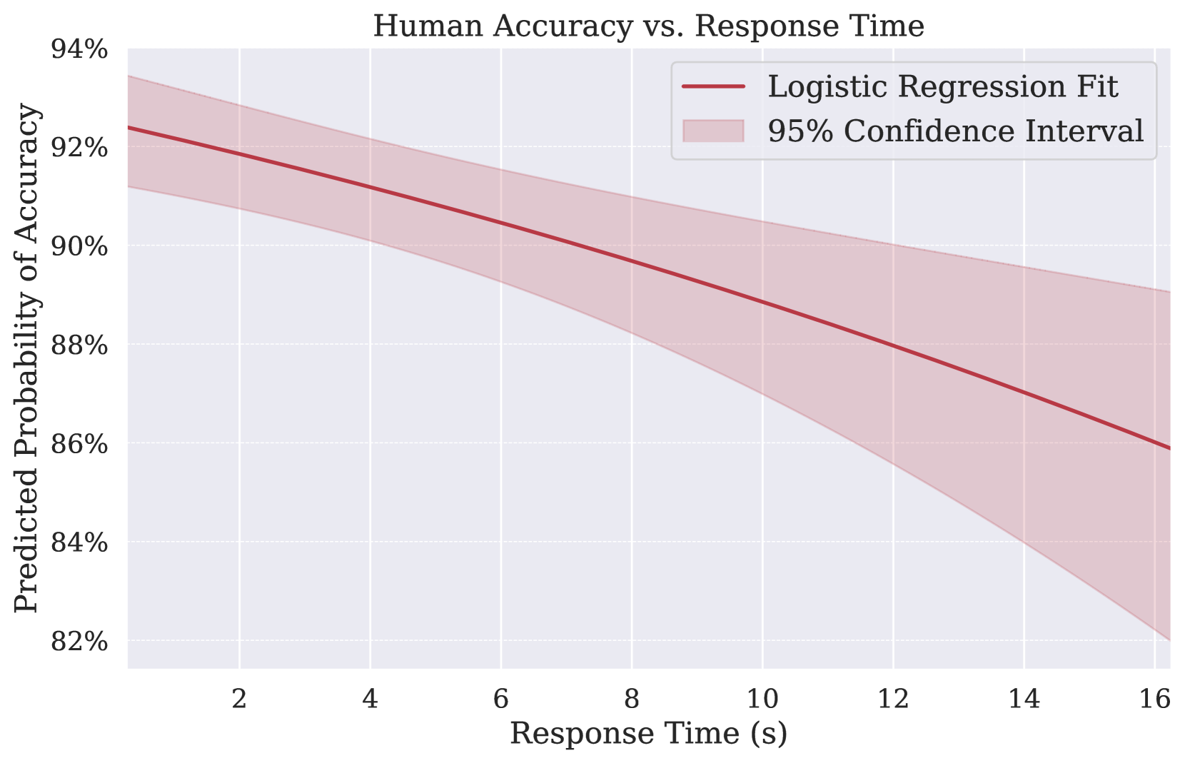 See Fig. 11. We submitted the response time details for every trial of valid participants (who passed all attention checks). The higher the response time of the trial is, the lower the likelihood of getting the correct response (). This indicates that people tend to spend more time on harder cases and still tend to fail on them.
