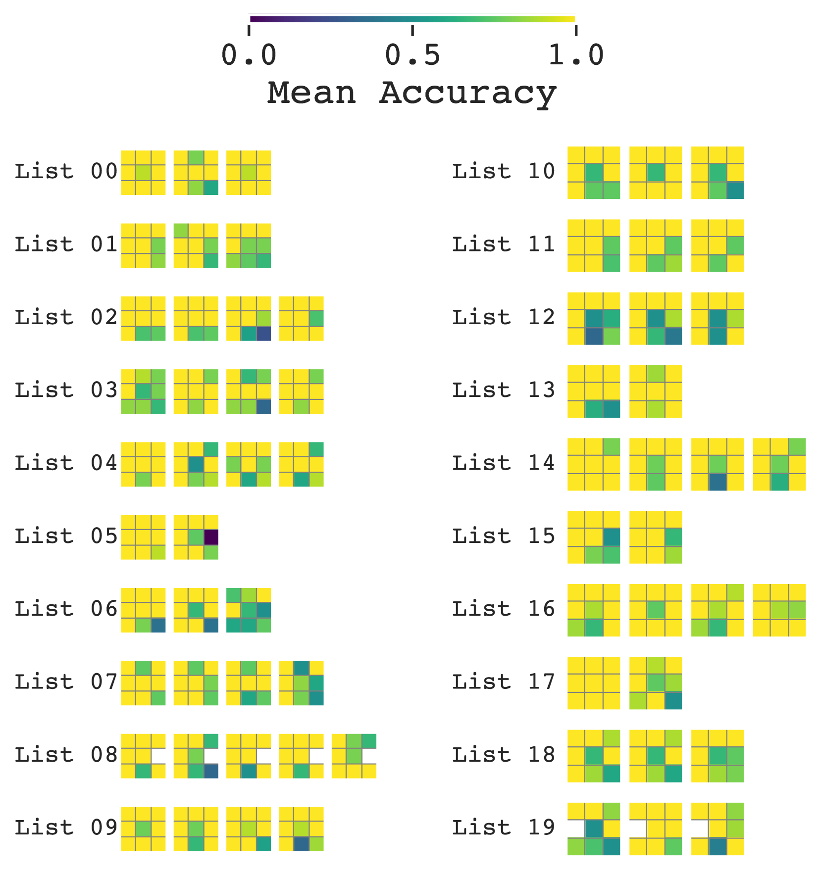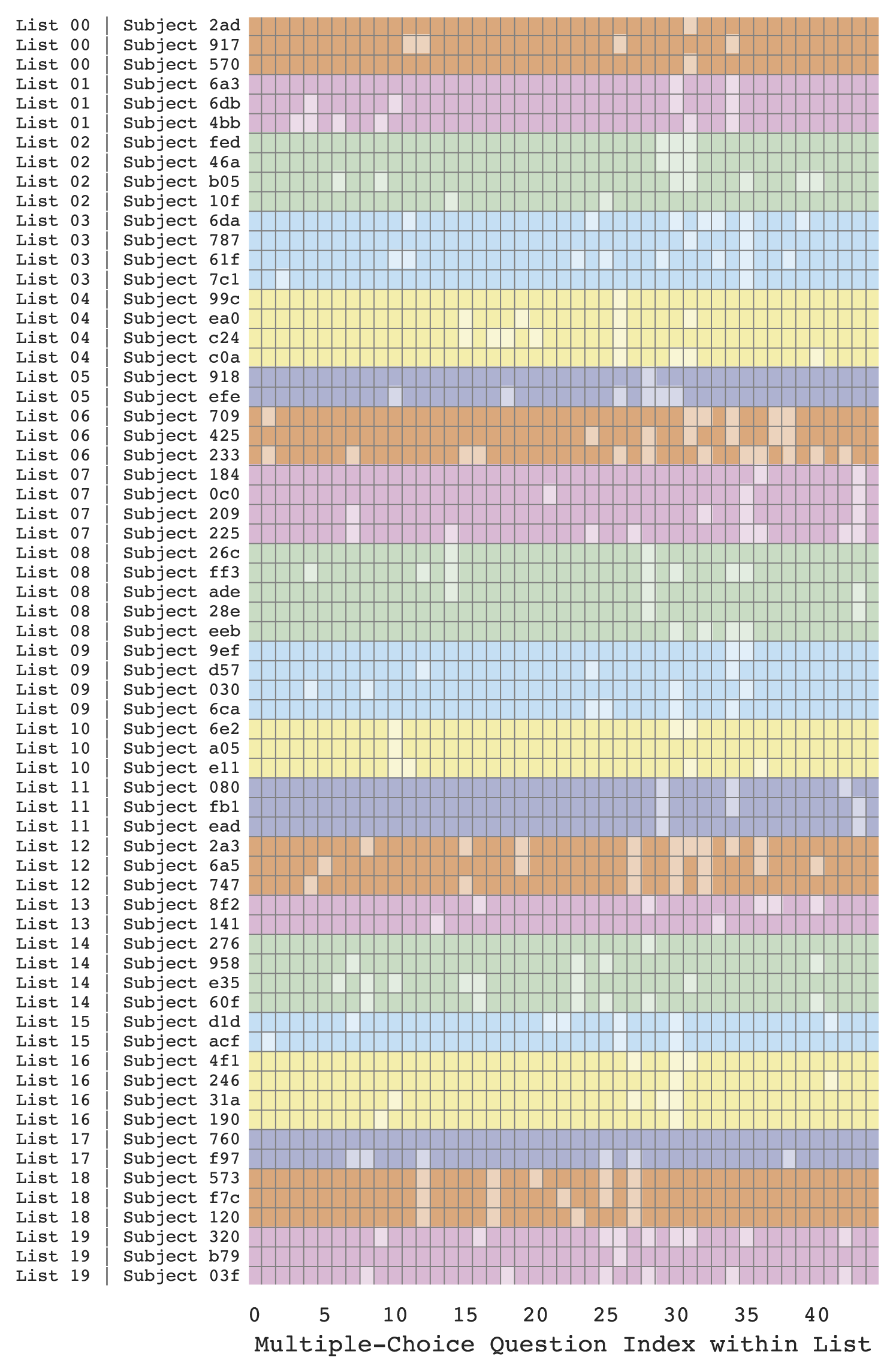 See Fig. 18. Again, participants were randomly assigned to one of the stimulus lists, each consisting of 45 test stimuli (shown here) and 7 predetermined attention-check stimuli (not shown here). Only participants who passed all attention checks are shown.