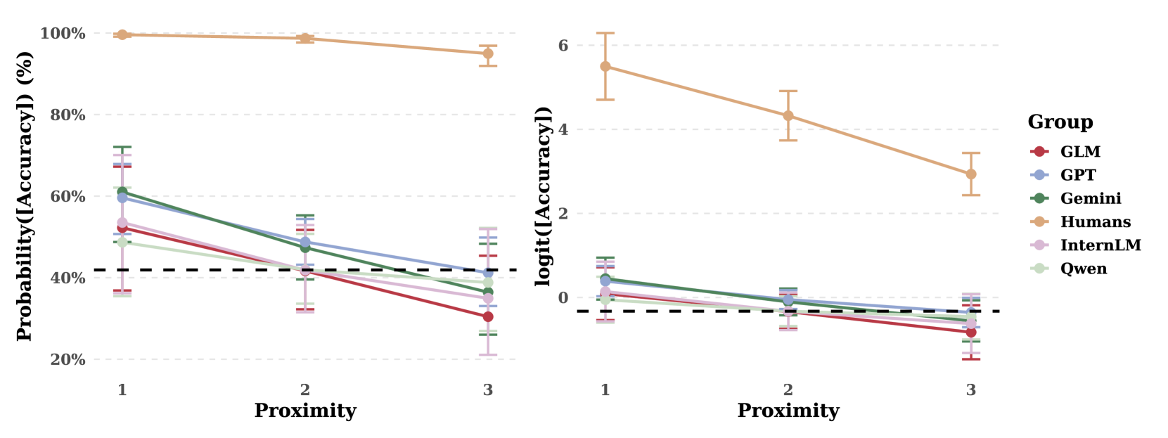 We found strong Proximity effect and Choice effect in both VLMs and humans. Surprisingly, no View effect is observed in VLMs while the effect is strong in humans. Table 1 and Fig. 6 depict an intuitive summary of effects found, while the full statistical model output and trends in the log-odds space (where effects are detected) are in Appendix A.12. Had we not included StimulusID as a random effect to account for correlations between trials using the same stimulus and simply run a logistic regression, we would have found all effects significant. This highlights the importance of using mixed-effects modeling in repeated-measure experiments.