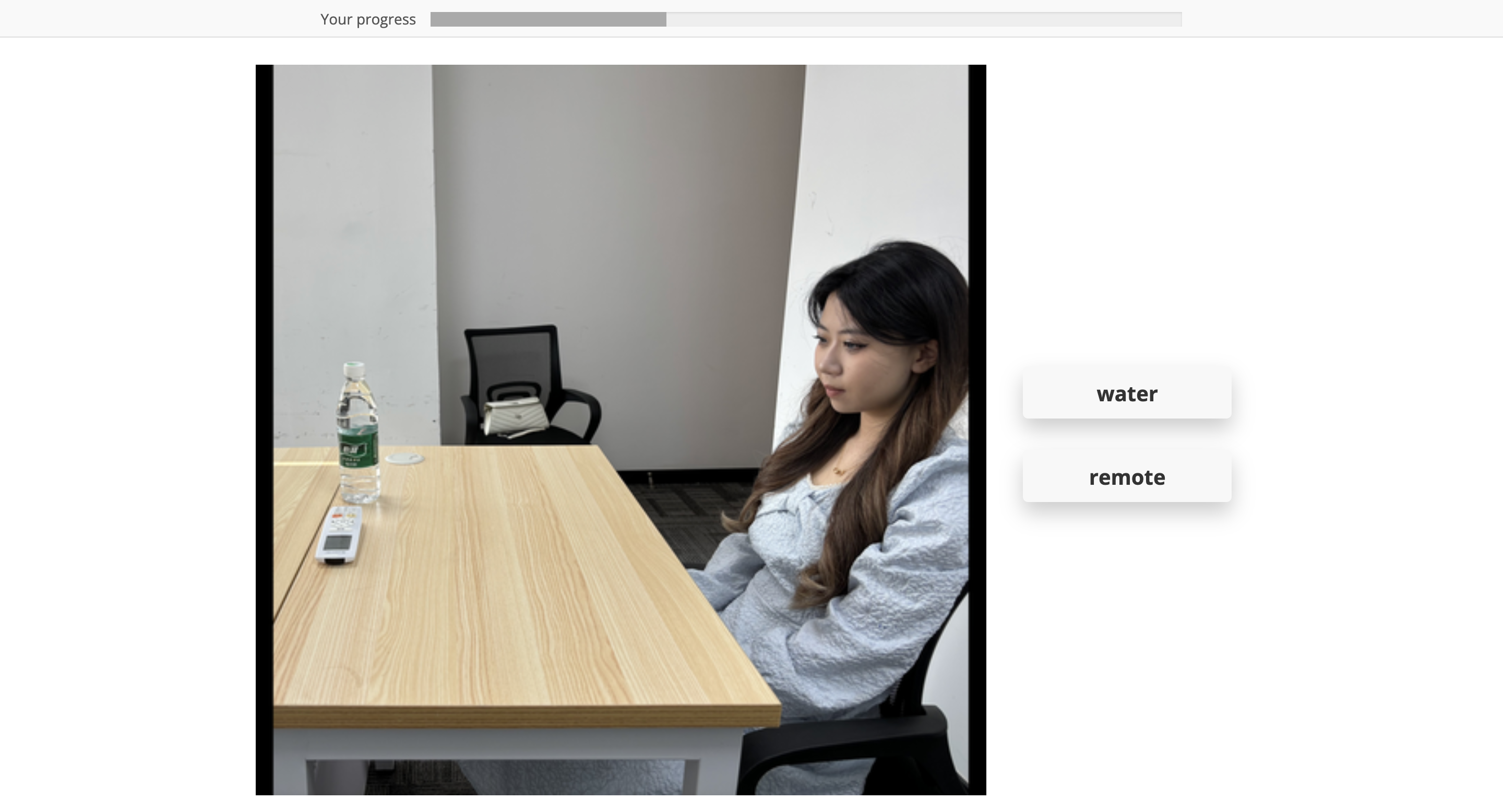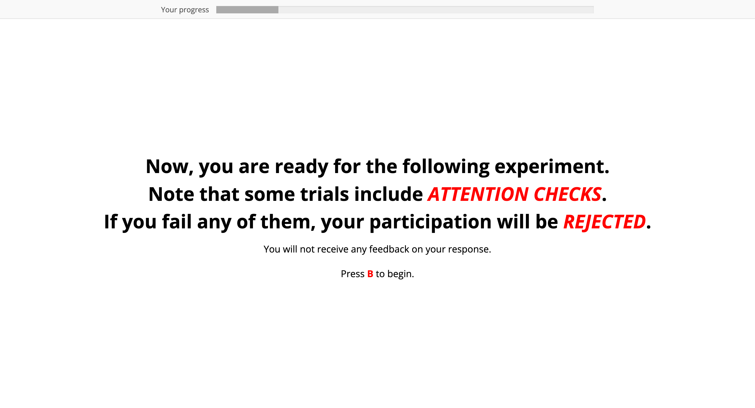 See Fig. 12 for screenshots of the survey. The participants click a button to enter full-screen mode and start reading instructions (they have to press different keys on the keyboard to ensure they read the instructions). Then, they go through three practice trials based on 3 of the seven attention checks with correctness feedback (in the form of a check mark or a cross mark with no sound). After that, they complete the 45 (test stimuli) + 7 (attention check) questions with a progress bar to motivate them, as the questions are relatively easy, but no correctness feedback is available. The stimuli in the three practice trials will appear again as attentional checks that look the same as the other trials. Four other pre-determined attention checks will also appear. Participants do not know which are attention checks, and they are warned to try their best for all questions. Even if they failed attention checks, they were still paid, regardless of the warning. Participants cannot go back and forth to make changes, but they can take as long as they want to answer the questions.