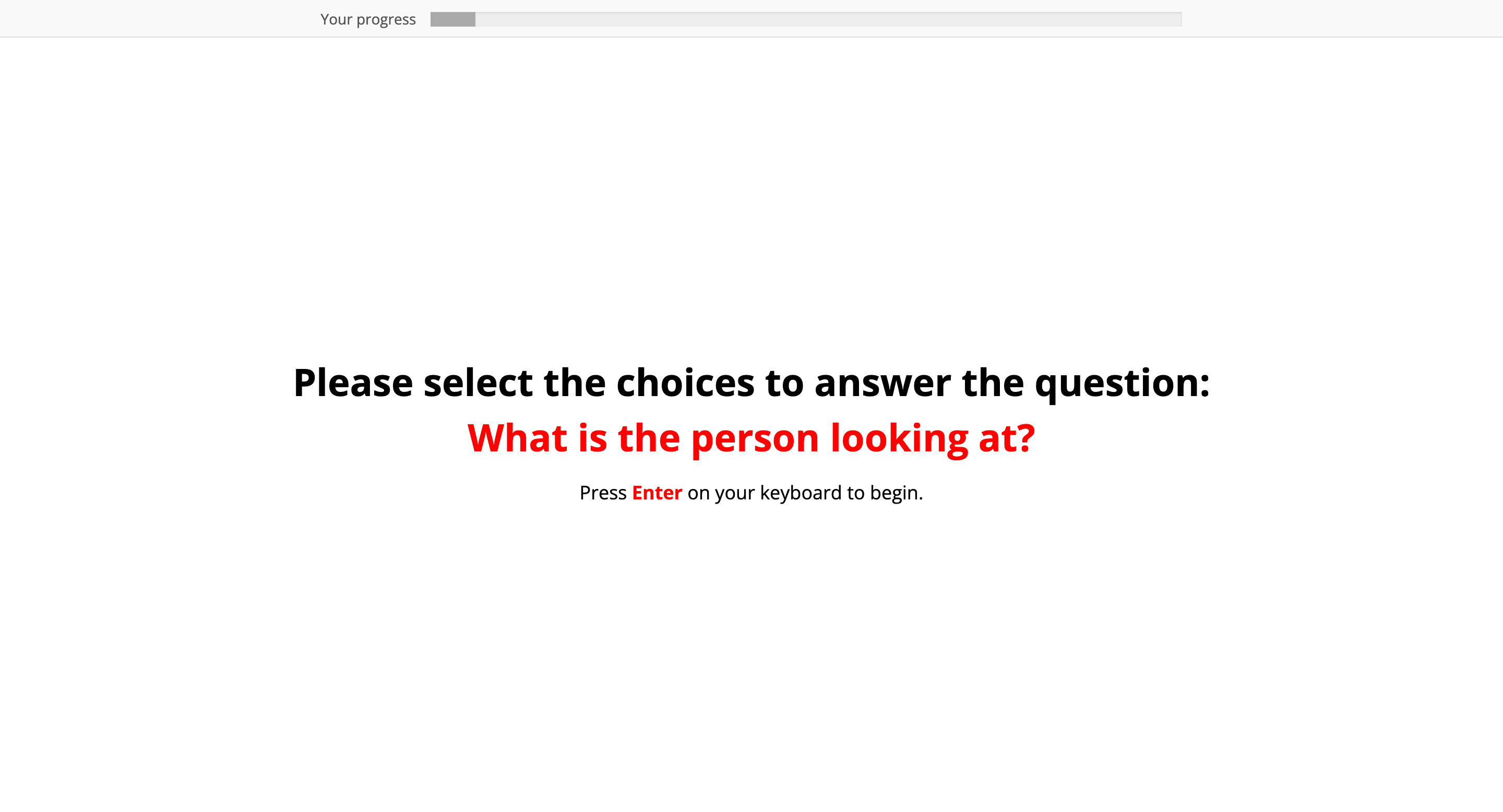 This study, like most controlled studies, suffers from the limited quality, amount, and diversity of the evaluation cases. The photos are of size 448 by 448, a resolution that is noticeably lower than what the human vision system provides. This collection of photos does not and is not meant to comprehensively resemble the rich visual experience that people will perceive in their daily life: All photos are taken in the same office space; only two actresses serve as the gazer; only 9 objects in total (See Appendix A.1). Still, the stimulus pool includes a range of gaze-irrelevant elements that increase the realisticness, including backgrounds with irrelevant objects, referent candidate objects with different visual salience, and facial decorations (for example, Actress X wore head decorations, and Actress Y wore false eyelashes and colored contact lenses). The fact that human participants can correctly infer gaze direction also indicates that the image resolution is not the bottleneck.