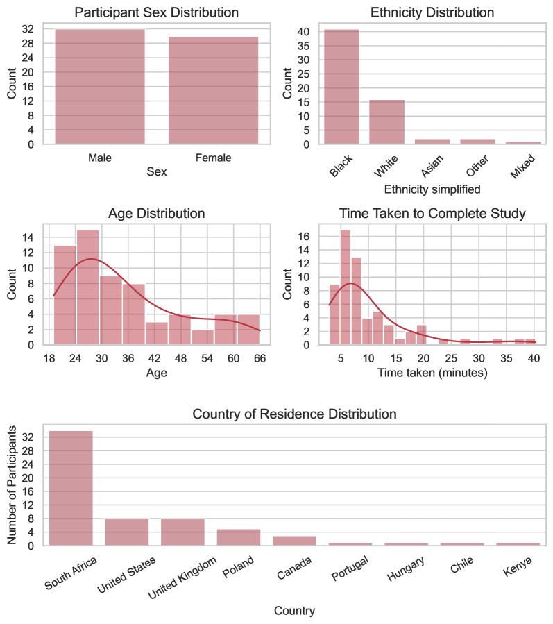 See Fig. 10 for the demographics of the 65 valid participants (those who passed all attention checks). Demographic data of some participants is missing and hence not plotted. All participants are paid an hourly rate of 12 USD regardless of their residence.