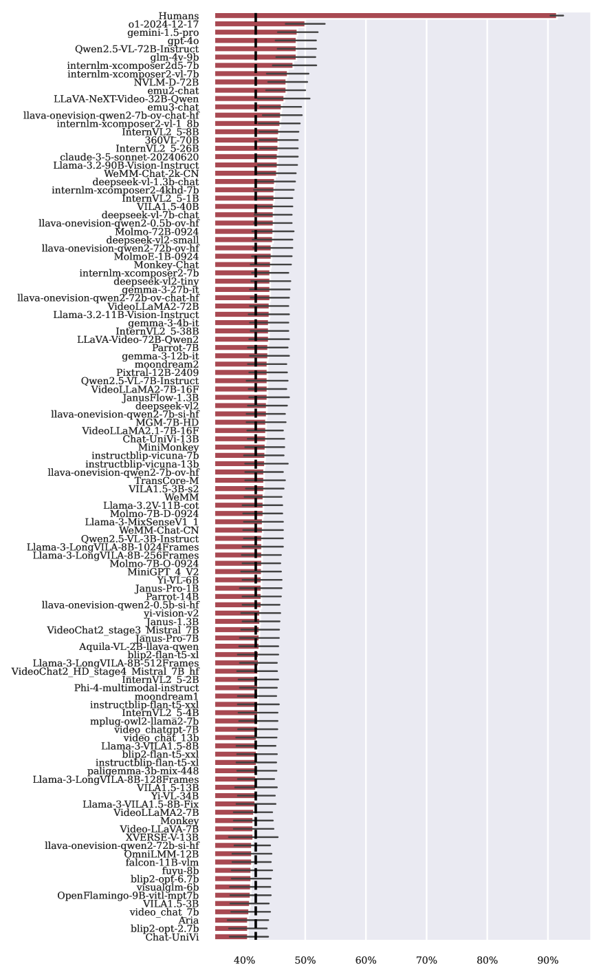 Analysis B features a focused group of top-tier VLMs, a larger sample size, slightly adjusted prompt templates, and mixed-effects modeling. Given that most VLMs perform close to chance, it is only meaningful to analyze the most performant ones closely. The five selected VLMs are: GPT-4o-2024-08-06 (OpenAI,, 2024), Gemini 1.5 Pro 002 (Gemini et al.,, 2024), Qwen2.5-VL-72B-Instruct (Qwen,, 2025), InternLM-XComposer2-vl-7b Dong et al., (2024), and GLM-4V-9B (GLM et al.,, 2024). They are five of the top seven most-performant VLMs in Analysis A, while InternLM-XComposer2d5-7b and OpenAI-o1 were not selected for redundancy and cost considerations, respectively. For a comparison of prompt templates used for Analysis A and B, see Appendix A.2. Instead of repeating each stimulus once for each VLM as in Analysis A, we repeat each ten times. This leads to 900 10 trials per VLM from 5 selected VLMs (Analysis A VLM responses were excluded from Analysis B) and 45 trials per person from 65 participants. As sanity checks, we visualized all VLM and human data points we get in Appendix A.8 and Appendix A.9, respectively, as well as the human performance by condition for every participant in Appendix A.10. These initial explorations are consistent with our hypotheses.