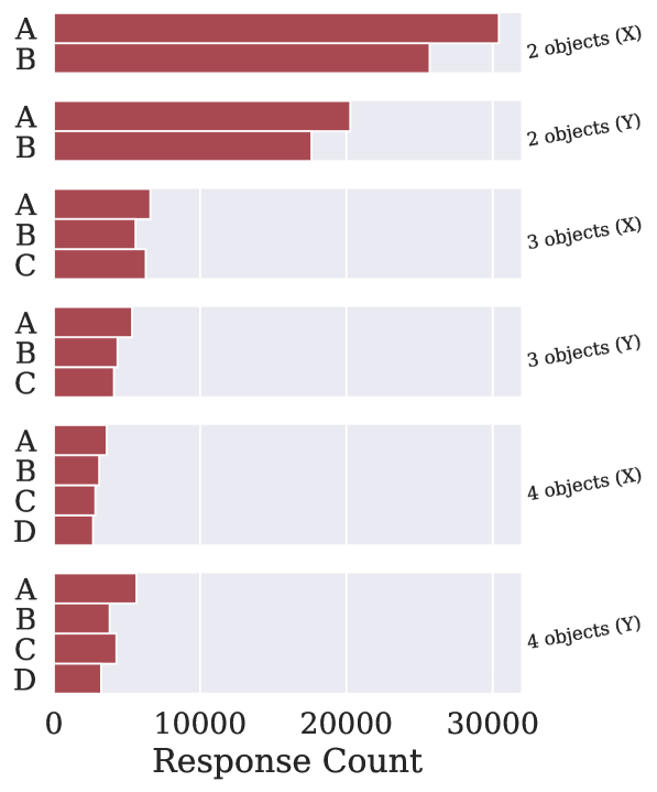 See Fig. 14 for the confusion matrices for each of the 18 combinations of Objects, across all 111 VLMs and 65 valid human participants. For each combination, the order of objects matches the order they appear on the table, such that nearby objects in the combination visualization are nearby in the stimuli (we did not counterbalance the order when constructing the scenes). Indeed, human results show that cells near the diagonal have a higher frequency than cells that are further away. For example, the remote and the doll are nearby in stimuli with a remote, a doll, a coffee, and a bottle of water, likely causing the second cell in the first row to achieve a high frequency in the bottom-right confusion matrix for humans. VLMs also show similar effects: as the correct answer moves from the first row object (e.g., the doll for the bottom-left matrix) to the last row object (e.g., the soccer), the proportion of trials that were responded with the first row object decreases, and the proportion of trials that were responded with the last row object increases.