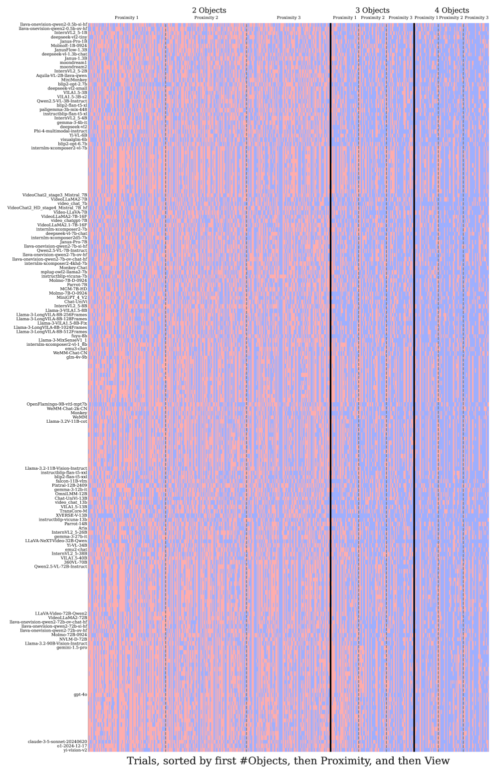 See Fig. 17. Each trial is represented as a colored cell. There are 900 columns, the same number as the number of test stimuli. Since VLMs involved only in Analysis A are presented with each stimulus once, and ones in Analysis B are presented with each stimulus ten more times, they occupy one and eleven rows respectively. Note that besides the five VLMs mentioned in the main text, Llama-3.2V-11B-cot was also evaluated using the Analysis B pipeline, such that each stimulus was presented 10 times, in addition to once in Analysis A. However, since its overall performance is close to the random-guessing baseline, we did not analyze its behavior.