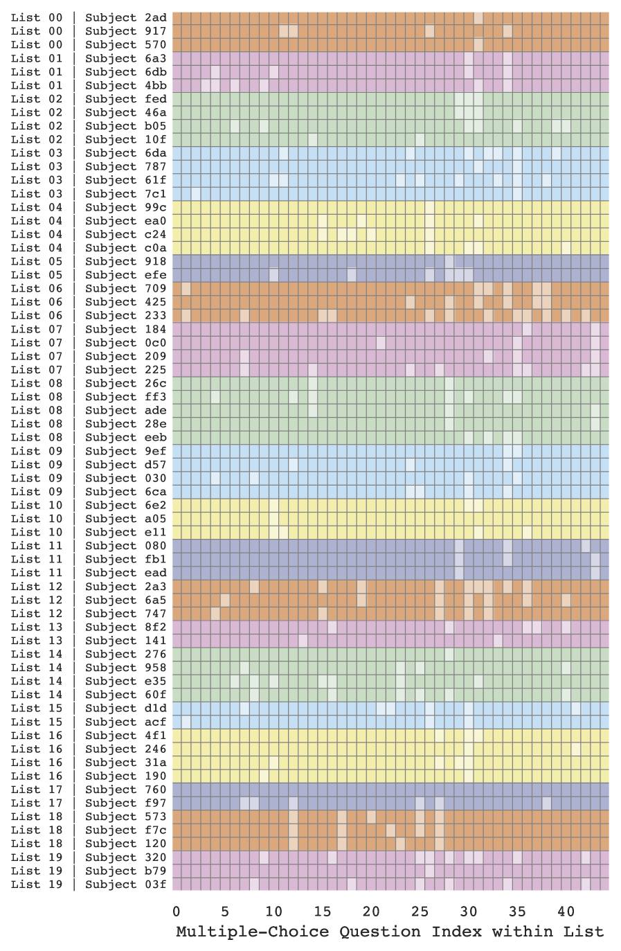 See Fig. 18. Again, participants were randomly assigned to one of the stimulus lists, each consisting of 45 test stimuli (shown here) and 7 predetermined attention-check stimuli (not shown here). Only participants who passed all attention checks are shown.