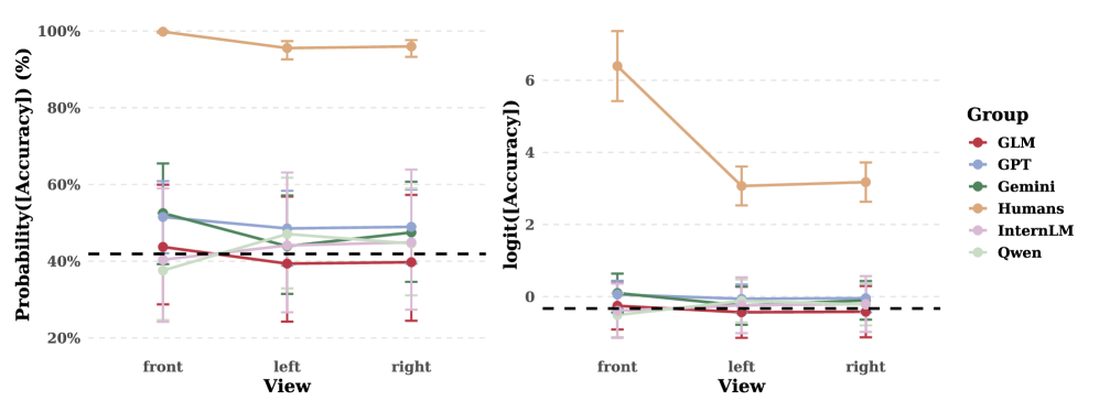 We fitted mixed-effects logistic models in R (Version 4.3.3) using the lme4 package (Version 1.1-35.5; Bates et al., 2015). The figure below shows the estimated marginal means obtained by fitting a mixed-effects model for each group, which then contributed to all curves of the same color in the figure. Dashed lines are the random-guessing baselines. The figures on the left depict variable relations with the accuracy in the probability space, while the figures on the right depict them in the logit space. Note that averaging is always performed in the logit space, as this is part of the reason why the link transformation is used in the first place. They also depict how probability space and logit space manifest the degradation differently: degradation is amplified when the accuracy is high (the case for humans) and reduced when accuracy is low (the case for VLMs) in logit space. No significant difference between marginal means for View=left and right.