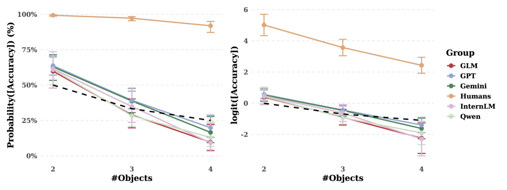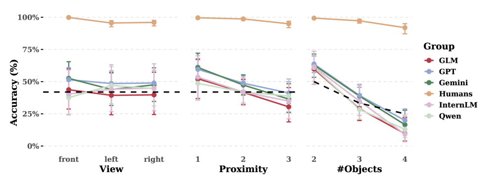 Including random effects allows us to capture the variability across random effects and reveals the sensitivity of VLMs’ performance to random effects. The lack of the need to account for random variability across PromptID for GPT, for example, indicates GPT’s performance is not sensitive to the prompt. For Gemini and Qwen, although taking the variability across PromptID into account leads to a better fit to the data, the variance of PromptID is less than 0.1, and therefore, they are practically not sensitive to the prompt as well. Similarly, they are not sensitive to the scene Objects, and the performance difference between View=left and right is not significant.