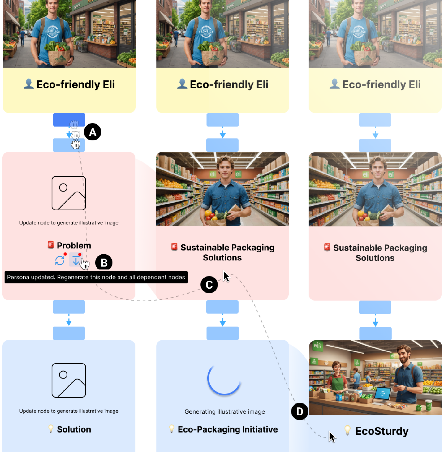 Node Elements. Each node features illustrative images (Fig. 5A) to enhance engagement and relatability—helping facilitate empathy with personas, and making problem and solution nodes more visually compelling and easier to connect with (DG5). To maintain consistency for nodes chained together, as shown in Fig. 4, nodes such as persona or solution nodes that are generated after their prior nodes use character description generated from prior nodes when generating illustrative images (See ‘Generate visual character descriptions’ in Table LABEL:table:prompts-images for prompt and Fig. 20 for pipeline).