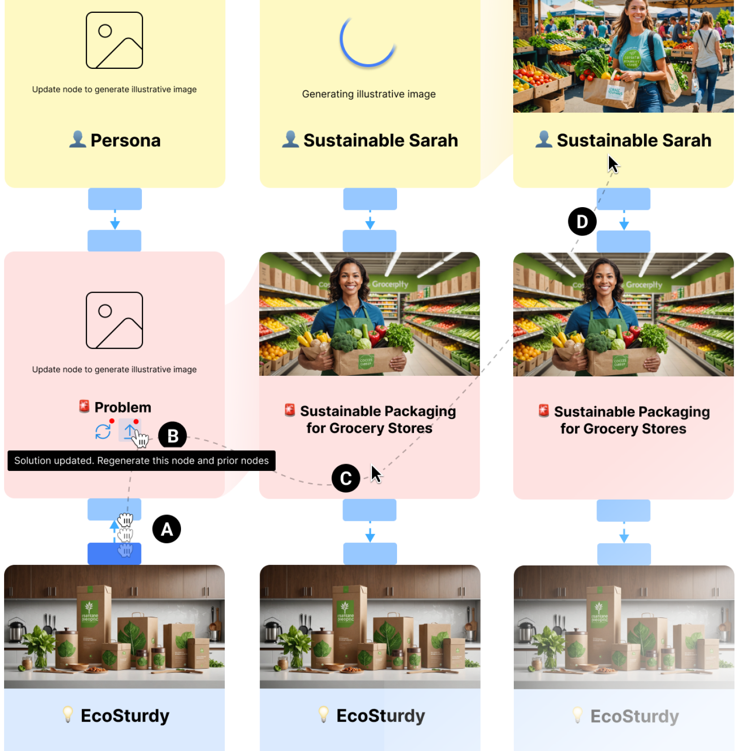 These connections serve dual purposes: they visualize relationships between design artifacts and function as pathways for propagating changes. When a node is updated, the system identifies connected nodes that might be affected and offers users the option to cascade these changes forward or backward through the dependency network. This interconnected structure ensures that modifications in one stage can be propagated throughout the design process, supporting the iterative nature of design thinking.