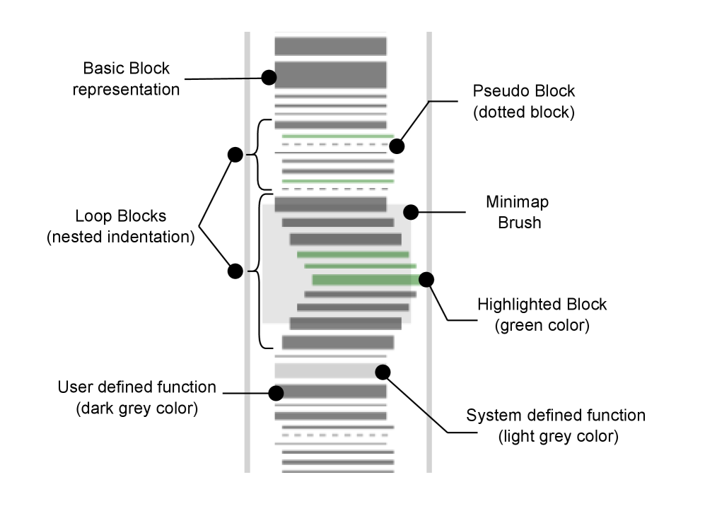 In designing the disassembly mini-map, we drew inspiration from the classic SeeSoft [13] pixel code view that is now integrated with text editors like Visual Studio Code. However, while SeeSoft-style visualizations of source code can leverage users’ familiarity with their own code’s layout, we do not expect the same familiarity with the disassembly code. Furthermore, the number of disassembly instructions under examination is typically much greater than the number of lines in a single source code file. We thus decided to depict basic blocks in the mini-map rather than individual instructions. We use the same width for each block rather than basing the width on the underlying instructions. While minimaps for source code can expect users to be familiar with relative line widths, the disassembly minimap is aggregating instructions and users are not familiar with their widths. Given this greater level of abstraction, we chose to use a set width. This choice further communicates it is blocks, not instructions, being shown. We show loop structures in the disassembly overview with indenting and use dashed lines to represent pseudo-blocks.