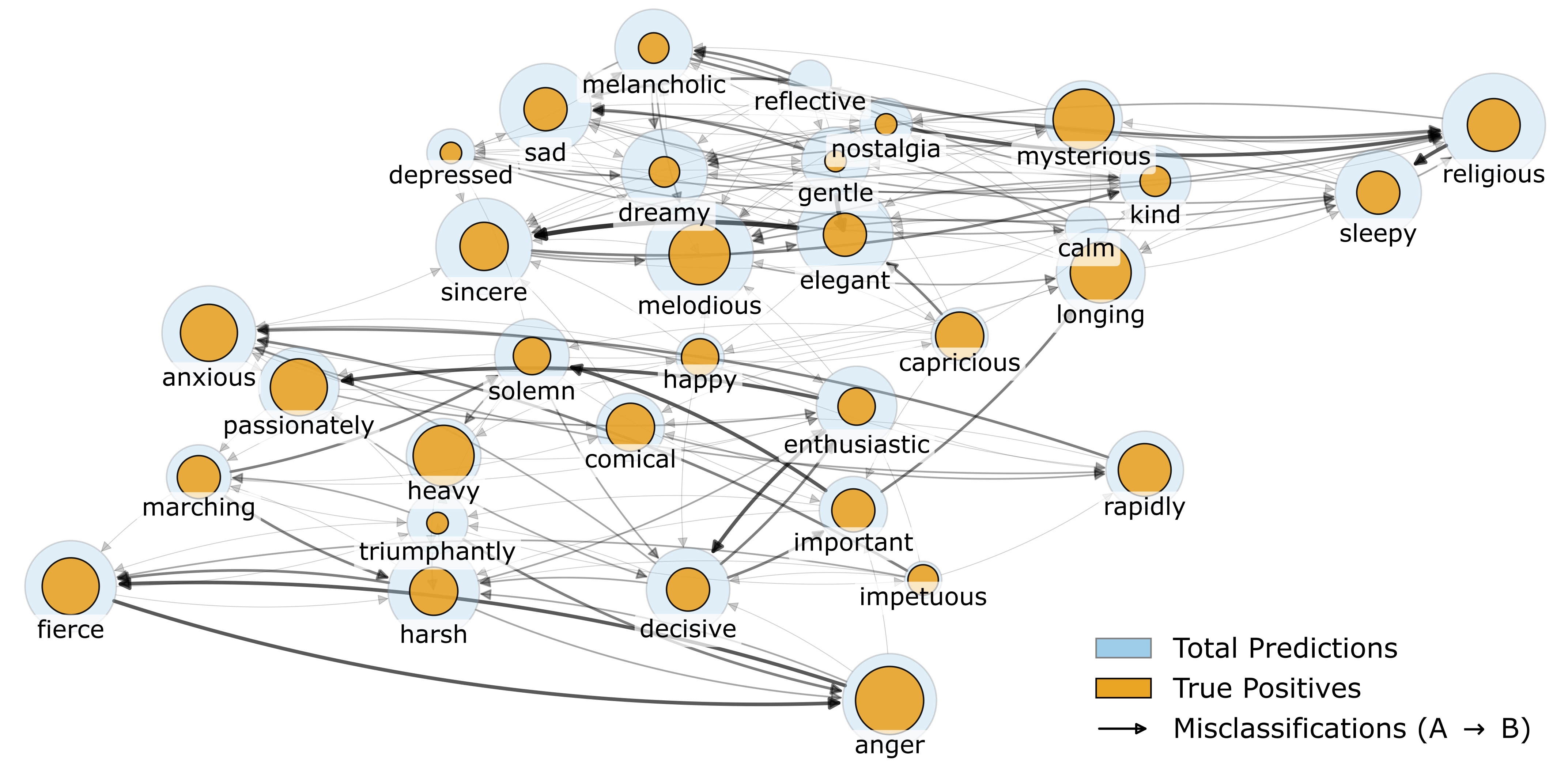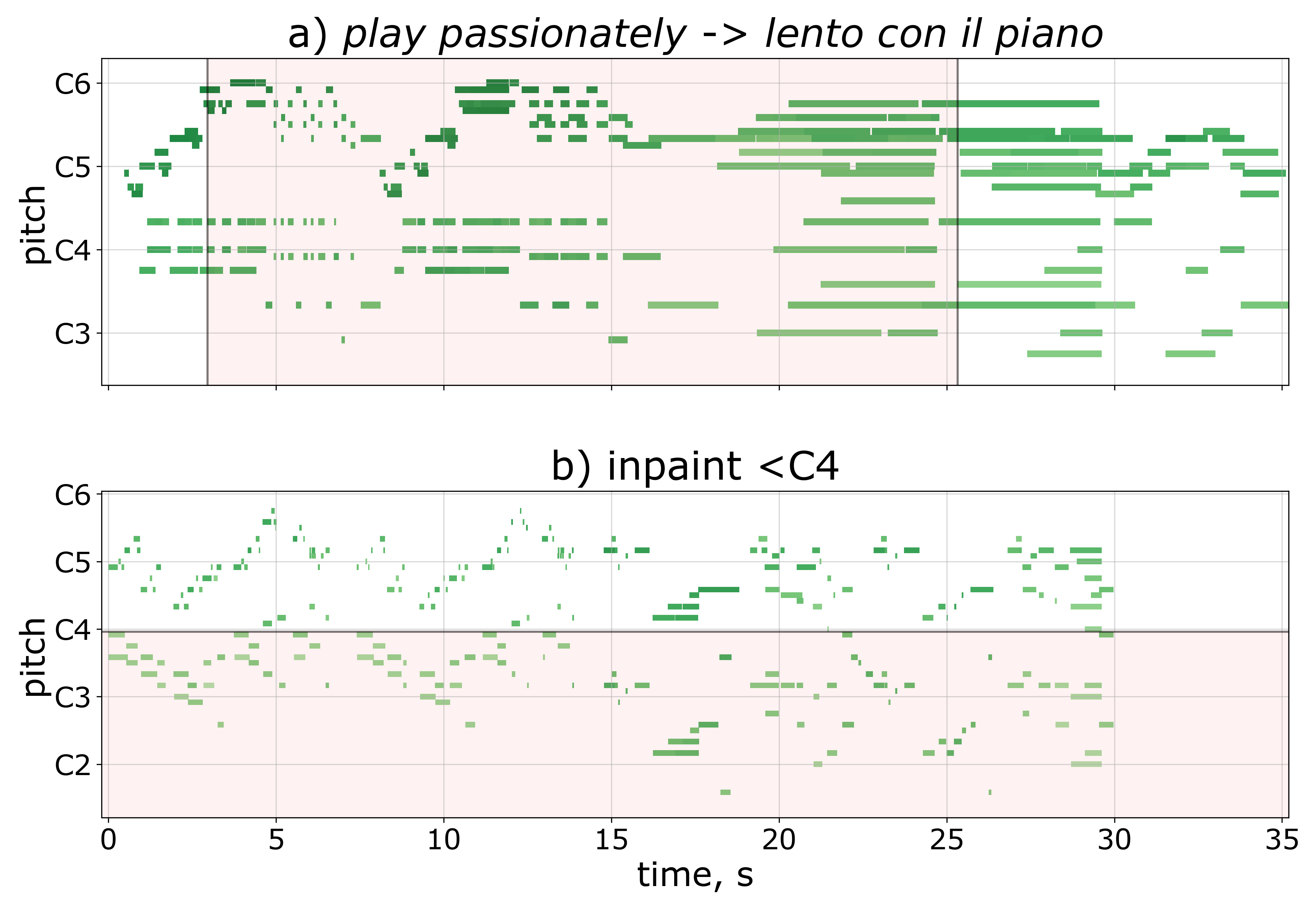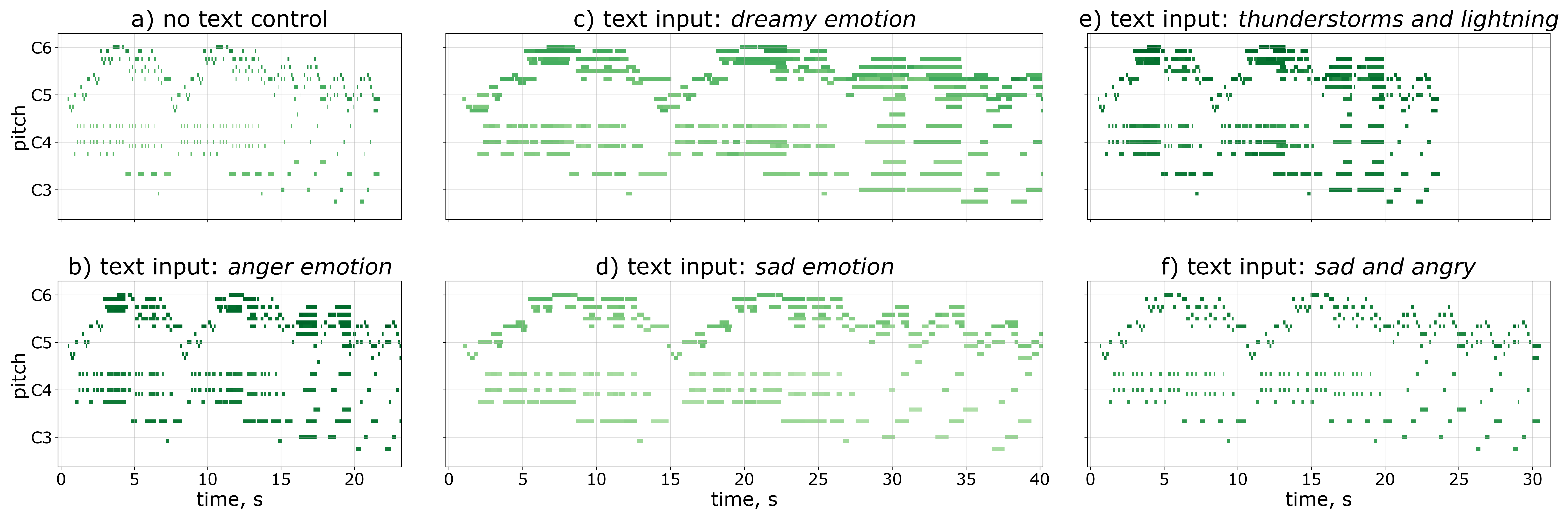 Finally, for the text-based control, we use the text embeddings associated with each performed musical bar. We design a set of 16 text templates that can describe the emotions in music, e.g., ‘[emotion]‘, ‘[emotion] music‘, ‘perform [emotion] music‘. The templates are sampled uniformly during training for each sequence and regularize the emotion-text space. We compute the average sentence embeddings for all 33 emotion labels and 16 templates using the pre-trained Flan-T5-base text encoder (Chung et al., 2024). We then take the emotion probabilities predicted by the trained emotion classifier, and for each bar we compute a weighted text embedding using the probabilities and emotion-template embeddings. Each note is assigned with a bar-level emotion-weighted text embedding.