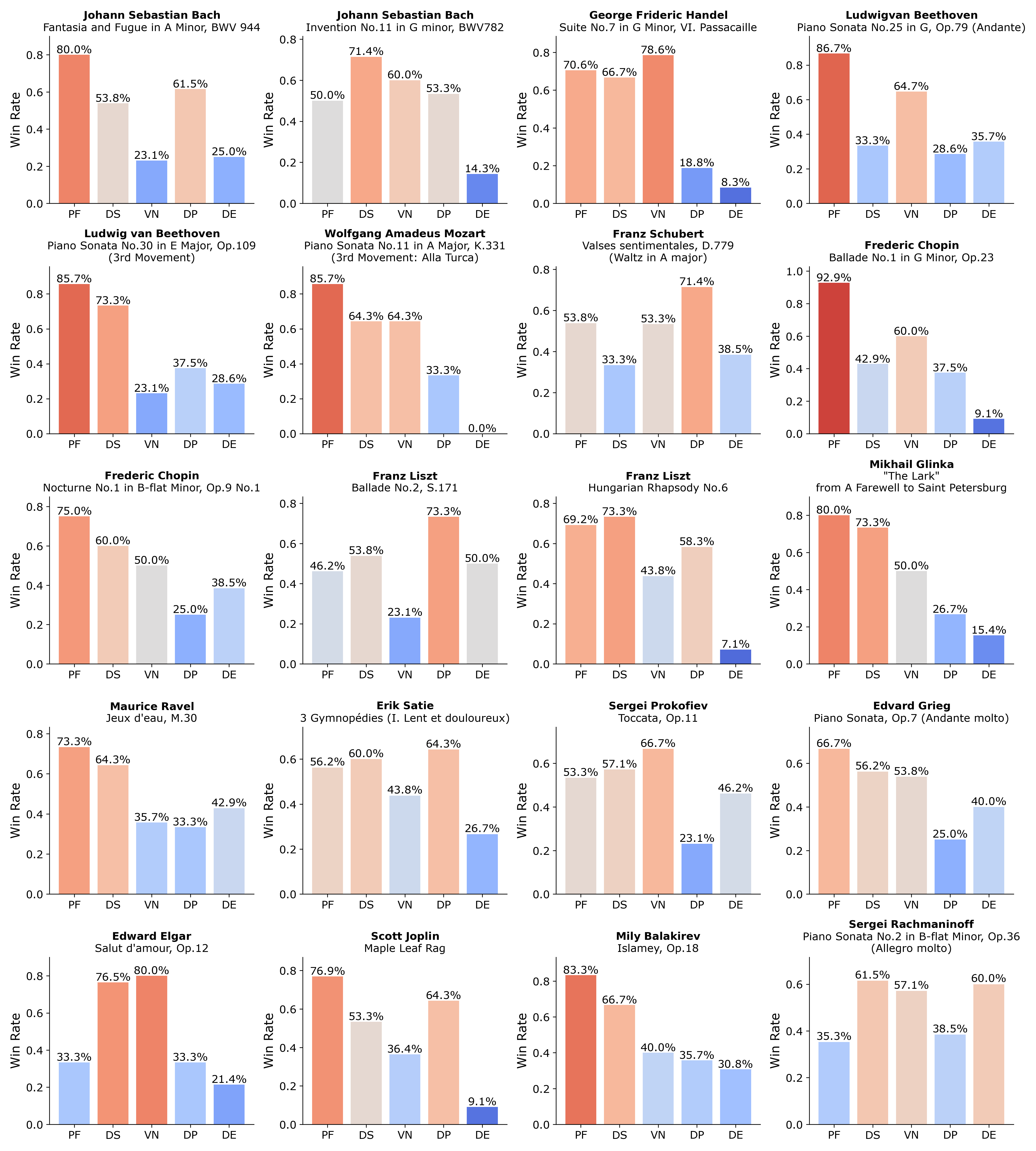 Figure E.1 shows the listening test results broken down by individual musical composition. Although these statistics are noisier than the aggregated model scores, some observations can still be made. For example, no model excels in all musical contexts. PianoFlow was preferred more for eleven pieces, while Dataset, VirtuosoNet and Deadpan performances were preferred for three distinct compositions each.