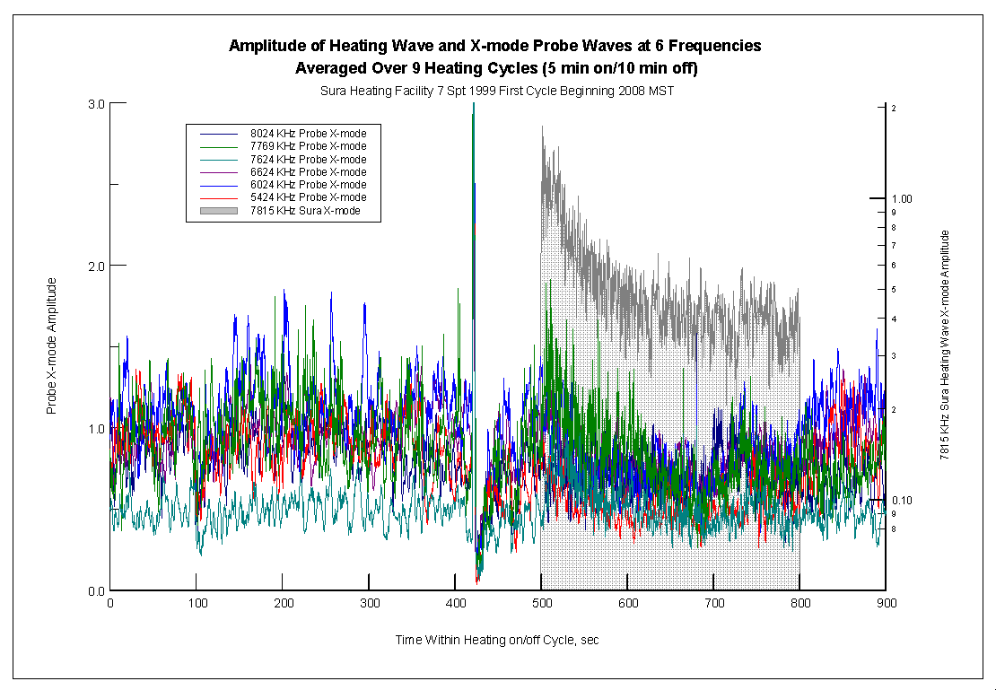 and increase of development time while the sounding frequency is increased. Maximal attenuation of probe waves is about 6 dB, attenuation of extraordinary pump wave at 7-th of September was 10 dB. Maximal phenomenon development time registered at 6-th of September for the waves at the low end of sounding bandwidth was ~50 sec. The decrease of anomalous attenuation with the grow of frequency does not necessary mean that the amplitude of irregularities is decreased while the altitude is increased as it will be shown below. The increase of development time, for our point of view, indicates that in the heated region some alternative process is developed (together with multiple scattering and transformation) which cause amplification of reflected waves. This point of view is supported by the fact that amplitude of ordinary wave reach the saturation regime only after some growth (see Fig. 7). The possible candidate for the role of such process is the development of induced large-scale (~ 10 km) irregularities, causing multi-ray reflection of probe waves. If we suppose that large-scale irregularities are weakly developed (or not developed at all) under the heating of extraordinary wave, we are ready to explain several peculiarities of obtained data. For example, the attenuation of probe waves of fixed frequency at 7-th of September is greater by approximately 2 –3 dB then at 6-th of September, the amplitude of extraordinary pump wave in experiment at 7-th of September is attenuated significantly, monotonously and rather rapidly, the increase of development time with the increase of frequency at 7-th of September is not so large as at the 6-th of September. Note that development time for the heating with extraordinary wave is approximately two times greater then for the heating with ordinary wave.