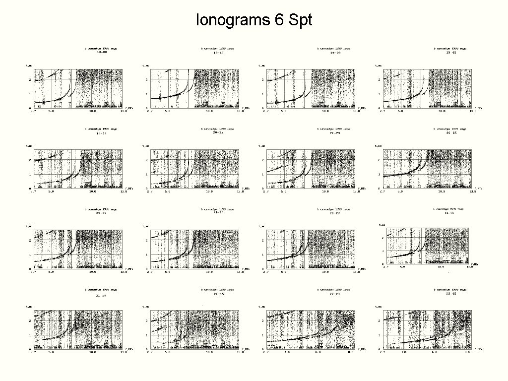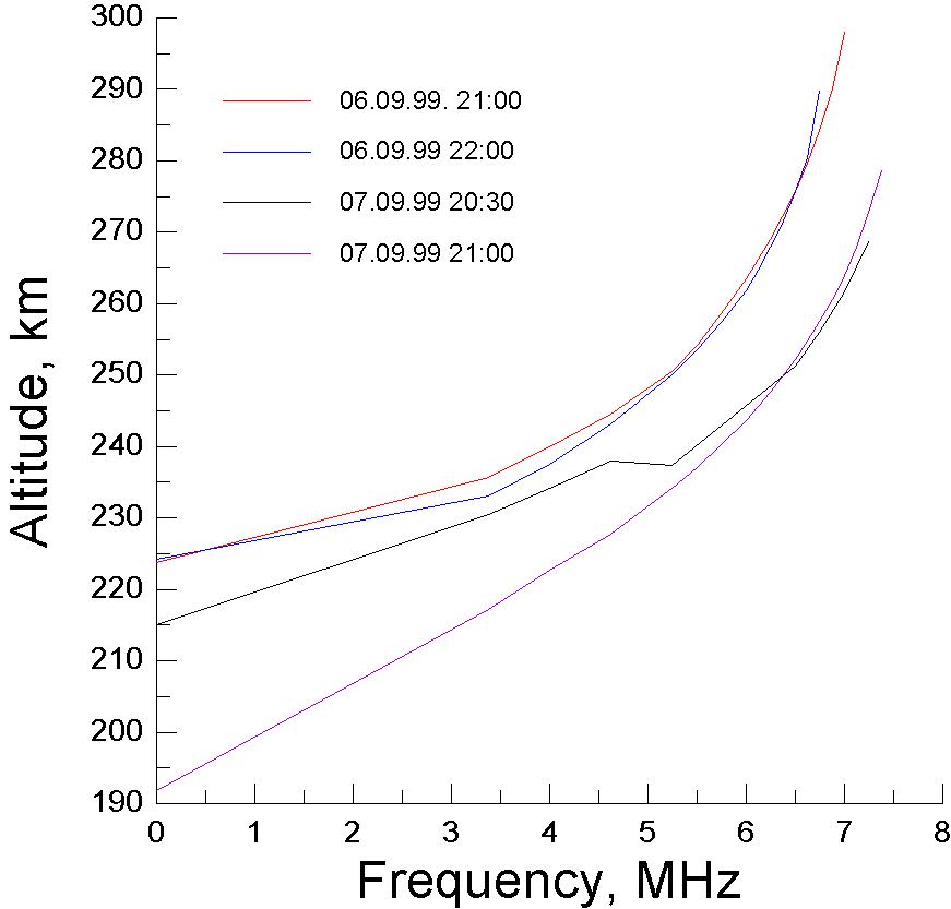 The primary data sets (records of amplitude for seven frequencies ) are shown at Fig. 1 (September, 6) and Fig.2 (September, 7). Each data set was averaged over the heating cycles. All data set for 6th of September was used for averaging except two cycles at the top frequency (left top panel). One frequency was removed from data set for 7th of September (fourth panel at right). For the most frequencies the averaging was performed over 9 first cycles (up to the transition of pump wave over the critical frequency), for the top frequency 5 heating cycles were used. The data sets for heating waves are shown at Fig. 3. Averaged data for 6th of September and 7th of September is shown at Fig. 4 and Fig. 5 correspondingly. Parameters of regular ionospheric profile were obtained from ionograms shown at Fig. 6 (6th of September) and 7 (7th of September). Calculated