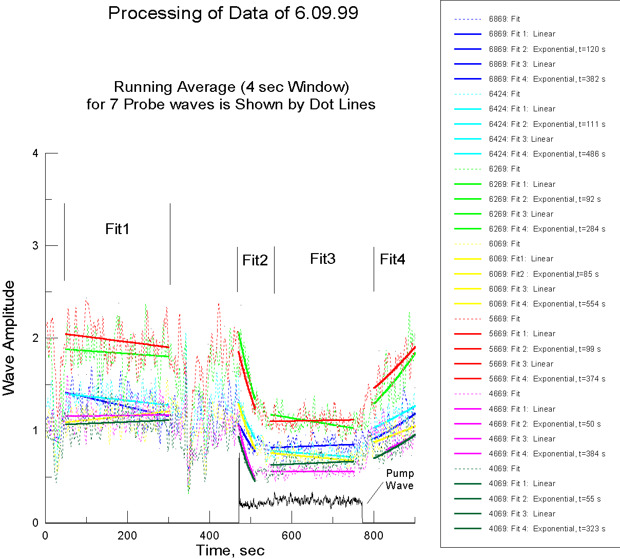 The method of determination of anomalous attenuation for 6th of September is illustrated by the Fig. 9. The averaged curves were divided into 4 different parts and the fitting was applied for each of them independently. Linear fits were used to determine saturated amplitudes before and after the beginning of the heating. Exponential fits are useful to estimate the development and relaxation times of the phenomena. The same fitting for 7th of September is shown at Fig. 10.