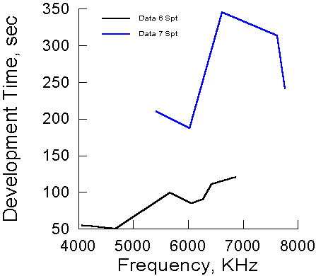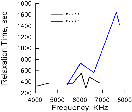 The dependencies of time of relaxation on frequency, shown at Fig. 13 are also of interest. For the experiment at 6-th of September this time is almost independent from frequency (i.e. the height of reflection in ionosphere) and is approximately 300 – 400 sec, what is 3 – 6 times greater than the time of the development. One may, evidently, conclude that for the frequency band where two data sets are overlapped the difference in time of relaxation for the data sets are less than the natural variance of this value. It means that time of relaxation does not depend upon the polarization of pump wave. For the high frequencies data for 7-th of September indicates the significant growth of time of relaxation, such that it becomes greater than the interval between heating cycles. So, the cumulative effect is possible, what may be noted at the Fig. 2 (three top panels corresponding to the high end of sounding band) as the gradual decrease of the amplitude of wave from cycle to cycle. It must be noted, that the drift of irregularities may be important for such large times of relaxation what may checked by simultaneous Doppler's shift measurements.