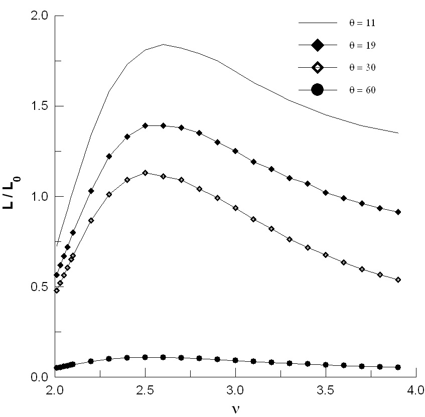 The results of calculations are presented at Figs. 2-6. At Fig.2 the dependency of anomalous absorption magnitude on the index of power-type spectrum of irregularities, calculated using approximate expression (20). There is no dependency upon the latitude of observation point in this case. The same calculations using the exact expression (Fig.3) display the expressed latitude dependency with significant decrease of anomalous absorption at low latitudes. Example of dependence of anomalous absorption magnitude on the inclination angle of geomagnetic field is presented at Fig. 4. This dependence is in qualitative agreement with the results of [12] obtained using a different approach. However, parmeters of power spectrum of random irregularities were determinied in papers [11,12] indirectly through the experimentally obtained radar backscatter cross-section for the heated region what makes direct quantitative comparison of results impossible. At Fig. 5 the ratio of anomalous absorption values calculated with expressions (21) and (20) as a function of index of power-type spectrum for different latitudes is shown. At Figs.6 a contour map of lines of equal absorption describing anomalous absorption as a function of index and structural function in the given scale (50 m) is shown. One can conclude from these plots that the magnitude of anomalous absorption reaches its maximal value when the index of power-type spectrum of irregularity is approximately equal to 2.5.