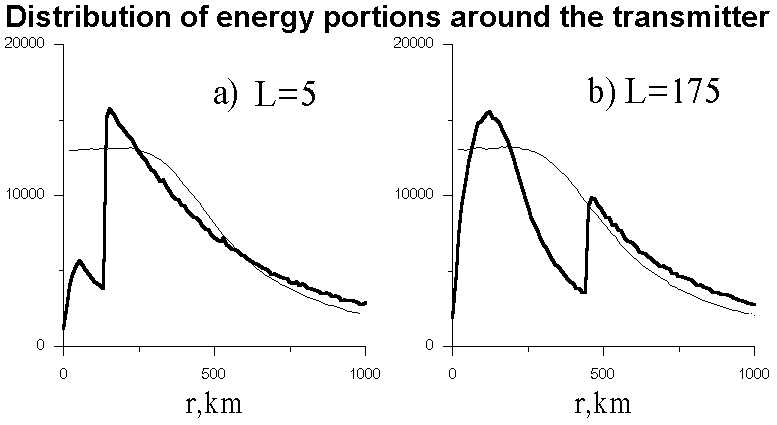 Some results of numerical analysis of this solution are presented on this plot. The map of anomalous attenuation values in the sounding station vicinity is shown. The nearly-elliptic region with strong attenuation exists which sizes are approximately 400 km in the NS direction and 100 km in the EW direction. The attenuation achieves of 15 dB at the place of sounding station location under chosen parameters. Another important result of the theory — main contribution to this effect give irregularities with scale length from several hundred meters to several kilometers.