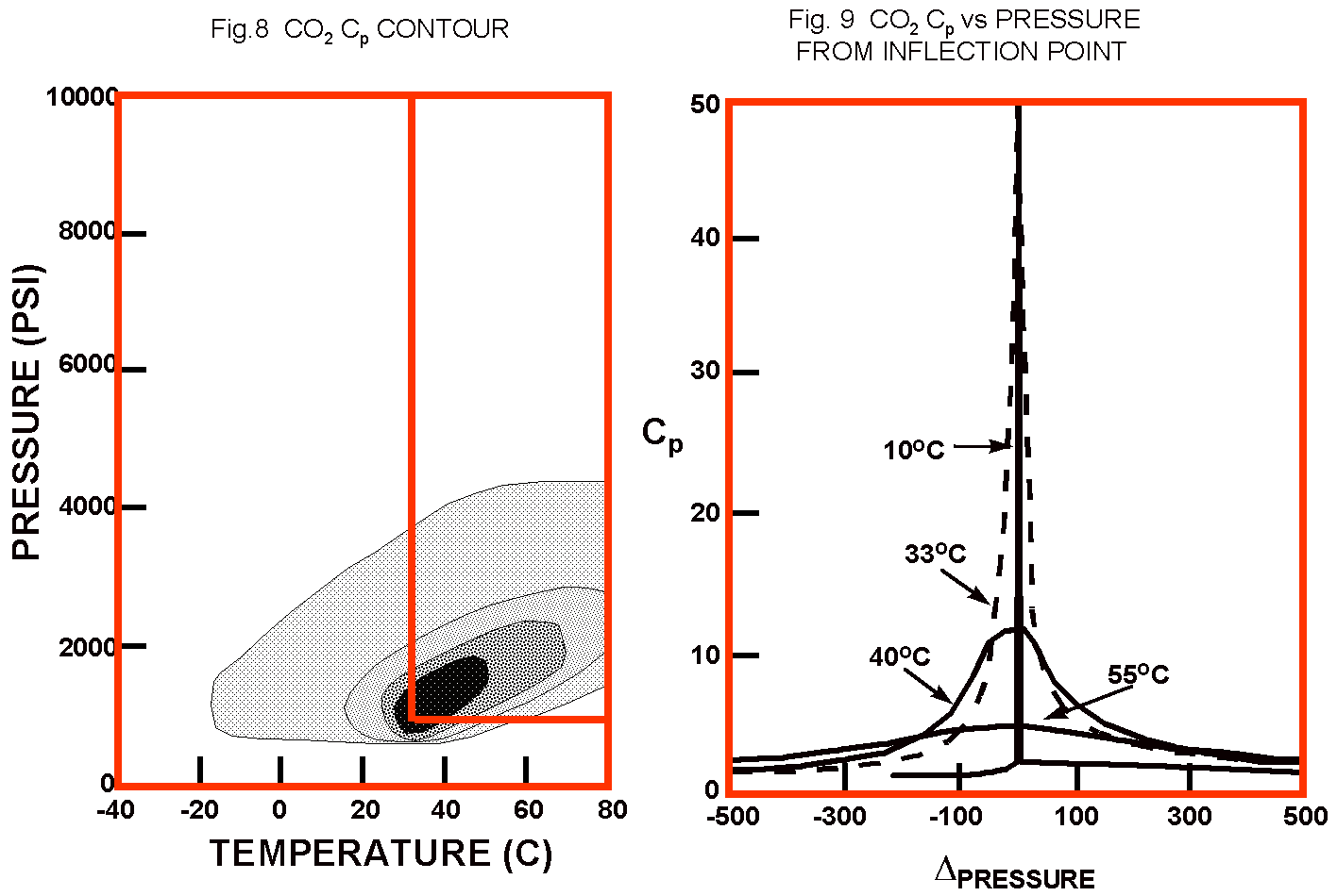 DHAB term were included, the CP in this region would go to infinity as the dT term becomes very small (see the 10oC curve in Fig.9). The changes become less steep as the temperature increases above the critical point.The heat capacity of a dense supercritical fluid at its phase transition point to gas is not as high as that of the liquid at its transition point to gas. In the small pressure-temperature region just above the critical temperature and pressure, a unique property occurs at the gas-to-fluid seam. This unique property is the ability to effect significant heat absorption or release without phase separation. If such a property is desirable in a fluid, it should be remembered that the pressure-temperature space for its utilization is very restricted.