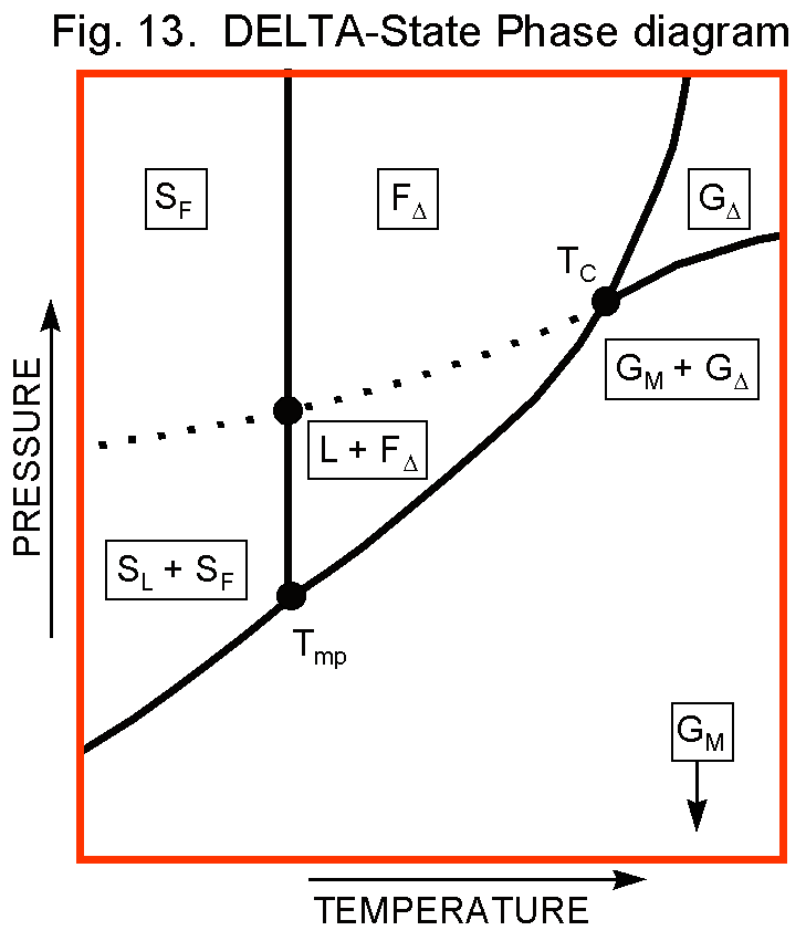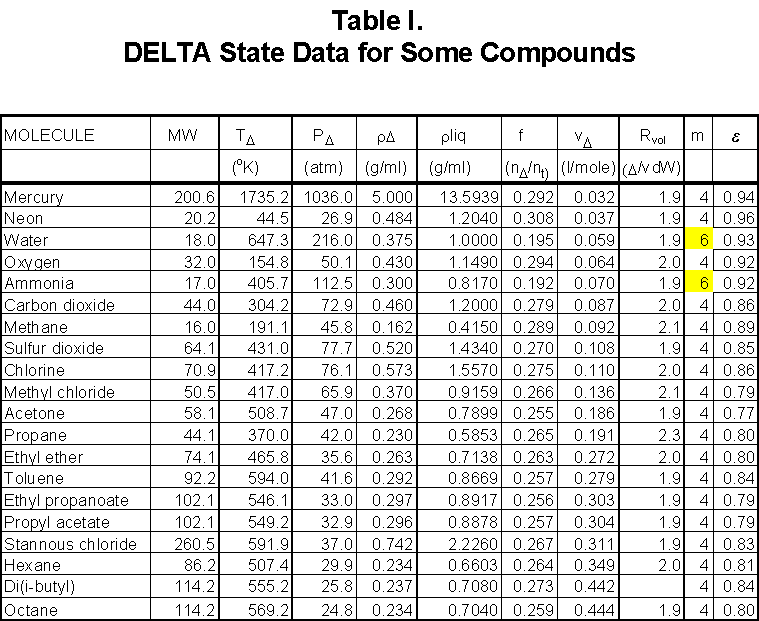 The DELTA state possesses a special set of physical conditions at the critical pressure and temperature point. It is at this point that the molecules are in the same close proximity that must exist in the liquid state - since they both have the same phase transition point here. This closeness allows for the volume of the DELTA state to be approximated. The model chosen here is one in which the molecules of the liquid are taken to be hexagonally close-packed (hcp) spheres (equation 4). Other models have been considered