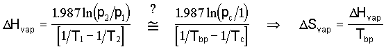 The nice (<10% difference) interrelationship between the measured heat of vaporization and that from the critical point and normal boiling point data provides a convenient check on all the individual datum. Thus, the entropies of vaporization in the literature (HBCP21) for BCl