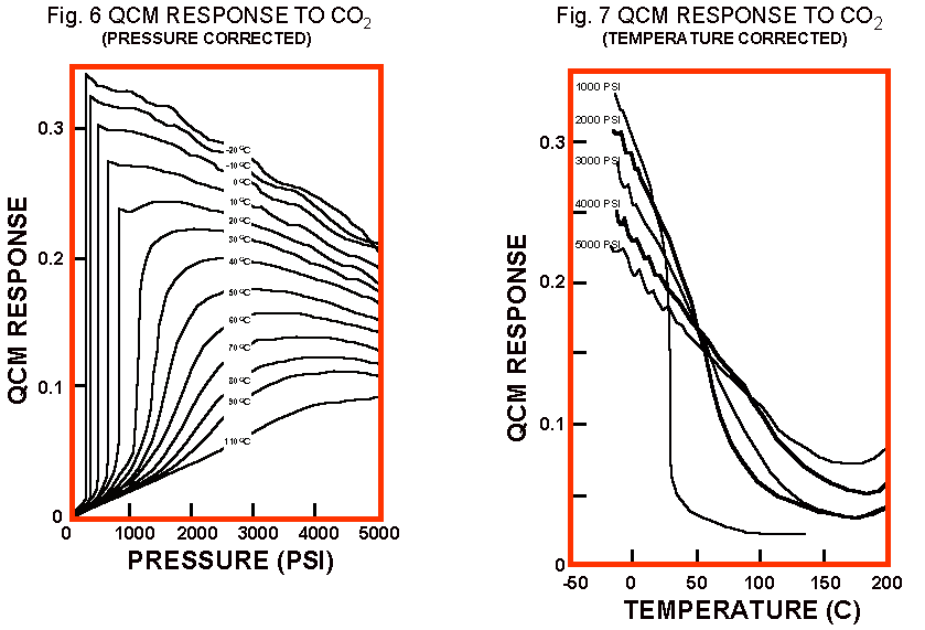 The apparatus used to determine the fluid nature of carbon dioxide under pressure consisted of the following major units: a tank of CO2 or nitrogen, an ISCO 260-ml piston-drive pump to deliver the fluid, a thermostating bath or oven, a pressure cell donated by Autoclave Engineers, and an Inficon quartz crystal monitor (QCM). The pressure cell contains an Inficon quartz crystal, a thermocouple, and a pressure gauge. The quartz crystal, which vibrates, was mounted vertically to prevent liquid from collecting on it. The pressure, temperature, and QCM readings are all collected on a MacIntosh computer using a National Instruments LabView program and interface board. The pump was controlled from the computer, but the temperature was set manually. A typical pressure-increase run was accomplished by allowing the temperature to reach steady state and then programming the pump to deliver fluid at the desired pressure while recording temperature, pressure, and QCM readings. Readings were taken until constant. In a typical temperature-ramped run, the pressure was set at the highest or lowest temperature and the temperature bath allowed to reach the other temperature at its own slow heating or cooling pace. Up cycles and down cycles were run to ensure that no hysteresis was occurring. The temperature and pressure responses of the QCM were determined by using nitrogen gas which is non-condensing over the temperature-pressure range studied.