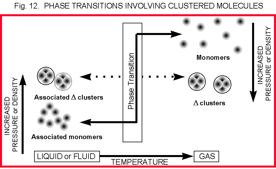 Think about the situation around the critical point: liquid no longer separates and the molecules behave as if there are fewer of them. Now make an assumption about what creates the liquid when the gas is cooled: monomeric gaseous molecules. A logical extension of this assumption will follow. IF no liquid forms at or above the critical point (even though a phase change occurs), THEN there must be no free monomers at or above the critical point. If there are no free monomers, then the molecules must be associating in some fashion. Ergo, clusters.Fig. 12 depicts the molecular-interaction situation. The molecules respond to the squeeze by traveling together in compact