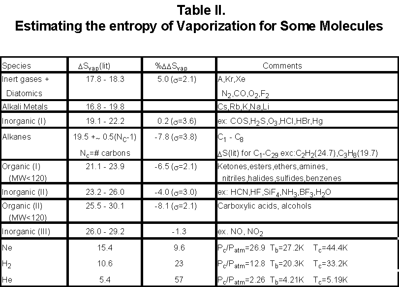 Equation 7 is considered to be true only for small deviations in temperature and pressure. It is constructive, however, to evaluate how predictions from the critical point and normal boiling point data, which are generally far removed, will agree with the measured heats of vaporization. Some generalizations are given in Table II. The