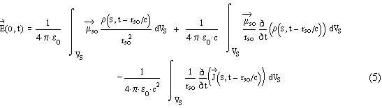 Equations (1) and (2) are correct if there are no superficial charge (coul/m²) and current (amp/m) densities upon the surface of Vs. In this work we will suppose there are no such superficial charge and current densities. To simplify the formulation, we have replaced position vectors in eqs.(1) and (2) by symbols "s" and "o". The observation point "o" could be outside or inside the source's volume Vs.
