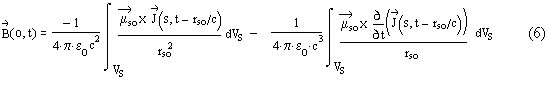 The first integral in (6) is the magnetic induction field. This term has same form as the static magnetic field but it depends on retarded time. The second integral in (6) is the radiation term of magnetic field.
