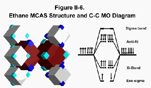 The C-C single (sigma) bond of ethane is like unto that for the chlorine molecule as can be seen in Figure II-6. Three electrons from each carbon are involved. The fourth electron of each carbon is exo-counterpoised to the bond – a feature noted for the hydrogen molecule. The sigma-Xi bond is their opposite. Instead of the anti-Xi electrons that occur in the chlorine molecule, their Xi-bond replacements provide the e-e repulsion that reduces the strength of the Xi-bond to that of a single bond. Thus, a B (bond) replaces the arrow in the MO. Of course, the B has a direction equivalent to the electron it replaces. Actually, the only electron involved is the one on the hydrogen that forms the bond. Using the B-arrow notation indicates the situation more generally.