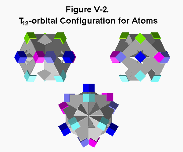 ¾ conditions comes the T12-orbital electron configuration for atoms (Figure V-2). The various components have been color-coded to further clarify the situation. The traditional py-orbital is replaced with opposing sets of three orbitals (colored green and aqua). These oscillating electrons will form P|-bonds. No electron transfer need occur between atoms! The "blue" orbitals will contain an electron or be replaced with a bond. The three "mauve-rose" orbitals in the plane contain one electron per atom, except for bridge-head atoms which do not contribute an electron. It is rare that an atom will "loan" more than one electron to the common cause. These orbitals will form P_-bonds. Electrons will flow from atom-to-atom in the plane through the P_-bonds. As with single and triple bonds earlier, there are no electrons on the axis between two nuclei.