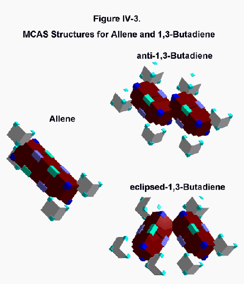 MCAS structures for allene and 1,3-butadiene are given in Figure IV-3. The reason for the perpendicular relationship of the protons in allene is readily apparent. In the anti form of 1,3-butadiene, the shortening of the single bond results from less anti-bonding electron repulsion. The "delocalization" energy of this molecule (and others, for that matter) is just the energy required to raise all of the electrons to the proper level when the double bonds are hydrogenated. Thus, electrons do not just effortlessly wander over to higher energy alignments, they have to be motivated to do so. That motivation comes in the form of reduced hydrogenation energy yield. In the case of the isolated double bond that is used as the "standard", only the electrons of the two atoms that make up the bond need any significant prodding and this prodding is lumped in with the total energy of hydrogenating the bond. There is no need to invoke P-bond delocalization in anti-1,3-butadiene since there is no need to assume P-bonding between carbons 2 an 3, only reduced anti-bonding electron-repulsion.
