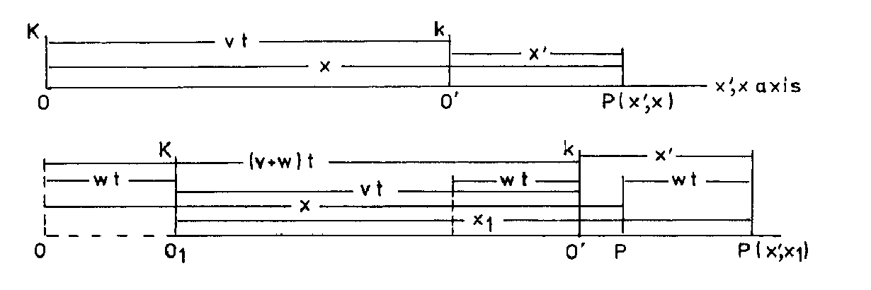 Let us have a look at the diagrams in Fig.1. We see that what they have in common is P(x’,x), which assigns a fixed point in k, and the fact that k moves with constant velocity v along the common x’, x axis after at time t=0 it coincided with K.