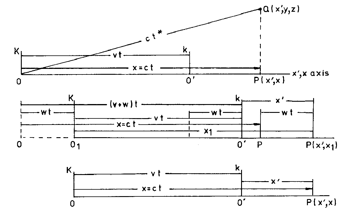 Let us further examine the upper diagram in Fig.2. K is at absolute rest. P(x’,x) is the projection of the space point Q(x’,y,z) onto the common x’, x axis.