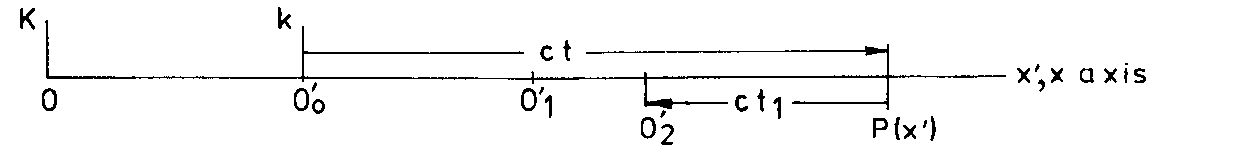 The light signal tracing the line segment OP=x and the origin of k leave the origin O of K at the same time t=0, and arrive at P(x’) and O’, respectively, at time t. Eq.(3) rewrites in the form