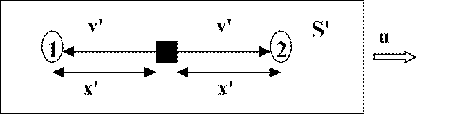 A view of the S frame where the two particles have equal and opposite velocities to regions 1 and 2 where measurements are made. The S frame moves at velocity u relative to the S frame.