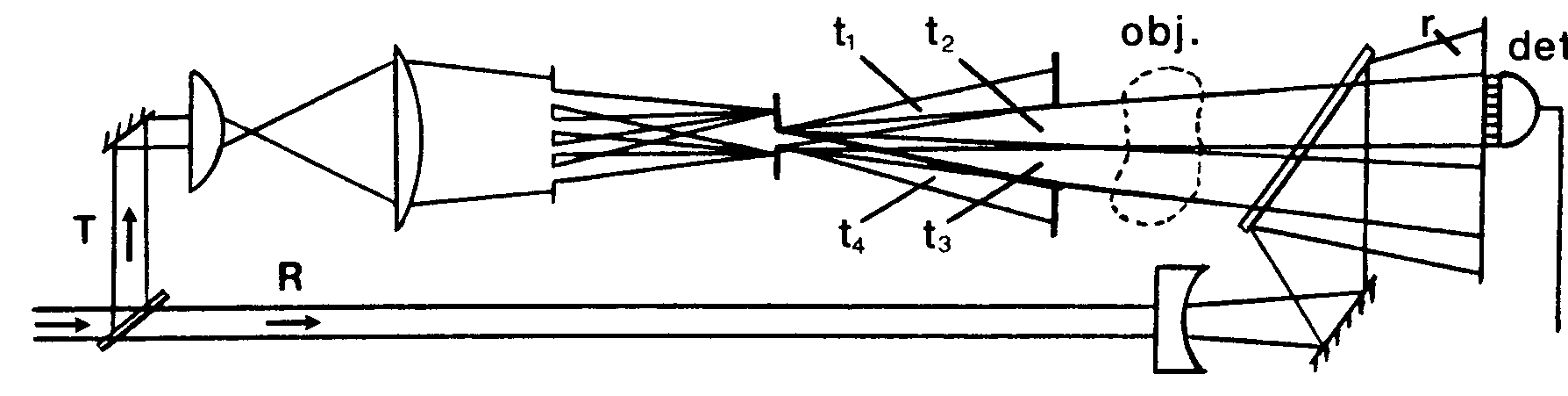 for the central angular region of t2. In the regions midway between any two output beams, the adjacent beam amplitudes mutually cancel. Fig. 1 depicts the non-zero central regions of the output beams.